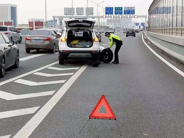 ◇ 9日,市民胡先生驾越野车刚上沌阳高架桥车胎就破了,幸亏三名汉警快骑主动帮忙,一边疏导交通,一边换轮胎,仅用了一刻钟车胎更换完成。