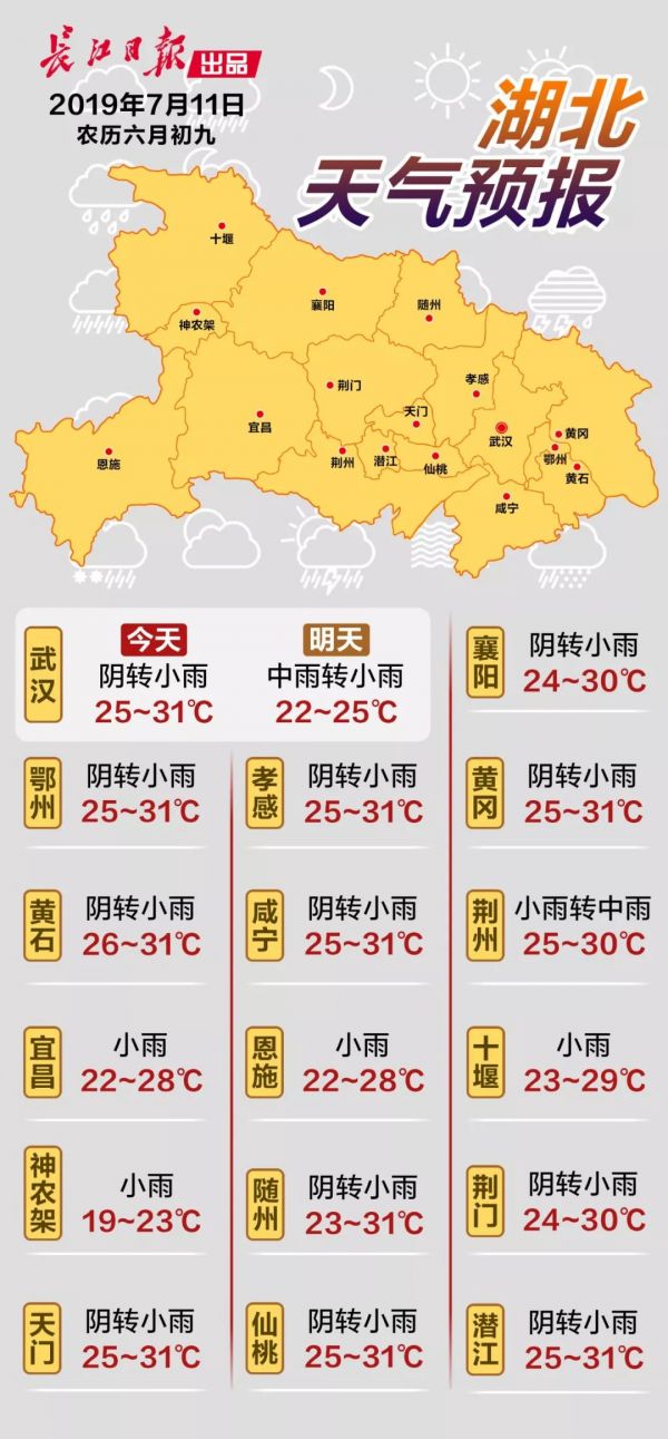 武汉还未“出梅”,降雨时有发生,气温也起起伏伏。今天白天多云天气持续,不过从夜间开始,武汉又有降水发生,受雨水影响,明天最高气温降至27℃,天气较为凉爽。