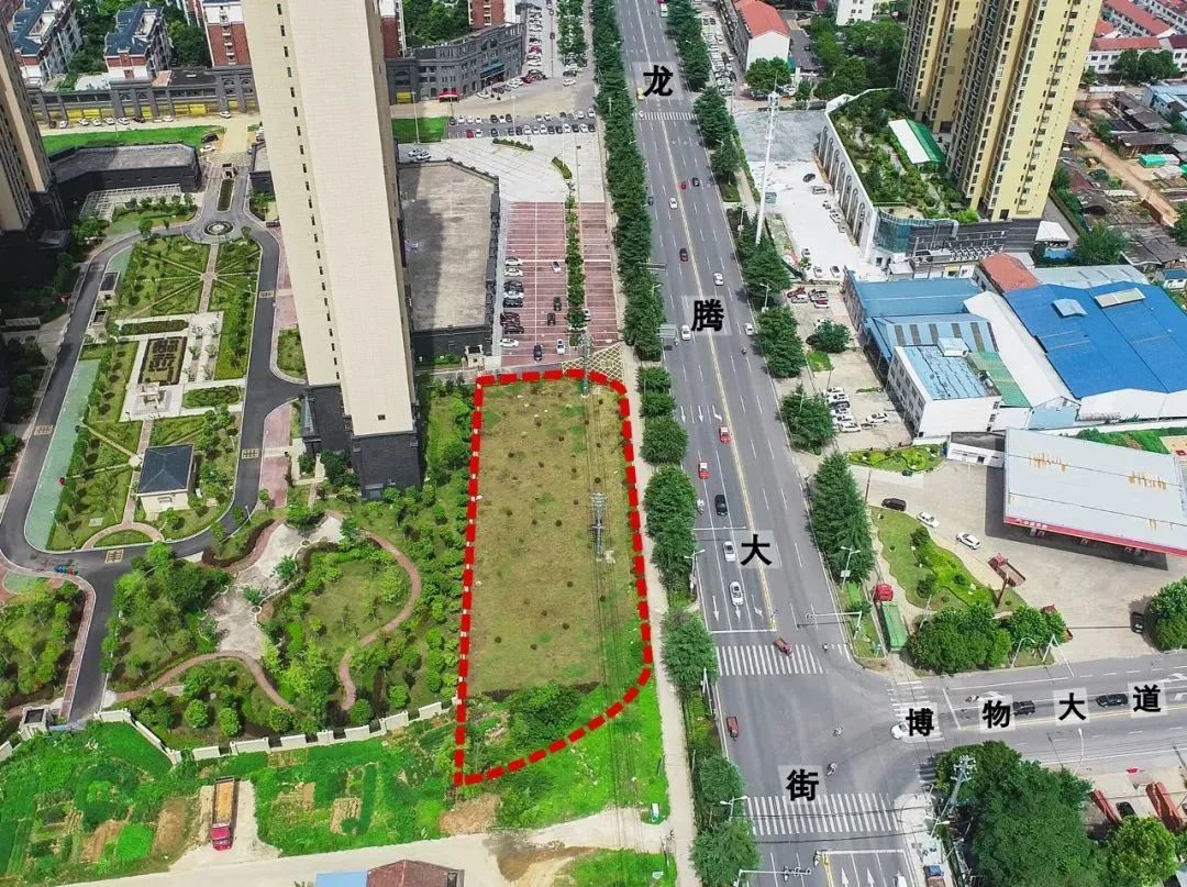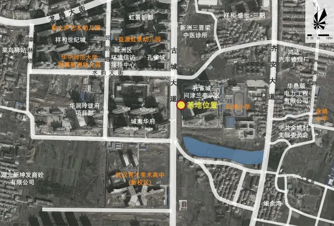 项目地块位于新洲区古城大道与水韵大街交汇处东南侧,东邻孔雀城问津兰亭小区,北临规划道路,占地面积约6230平方米。周边以新建居住区为主,附近有华中师范大学附属新洲幼儿园、问津小学、武汉育才美术高中等教育设施,距离新洲人民广场600米左右。基地现状为闲置绿地。