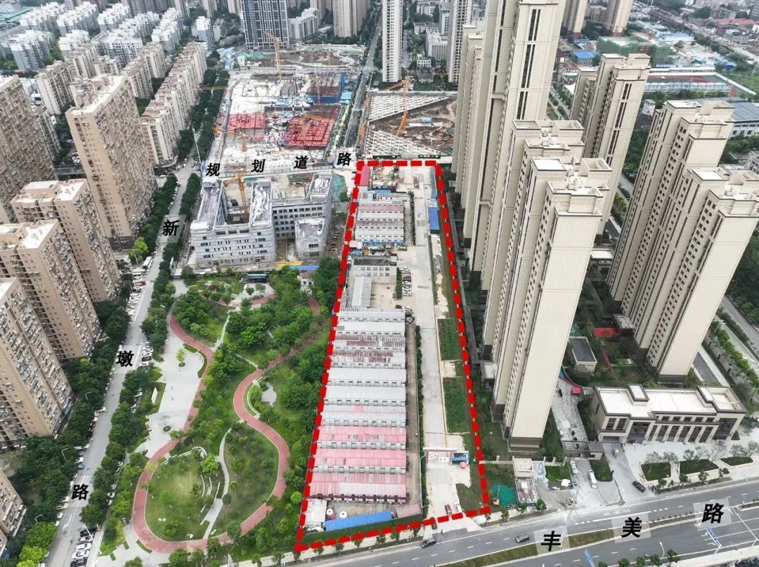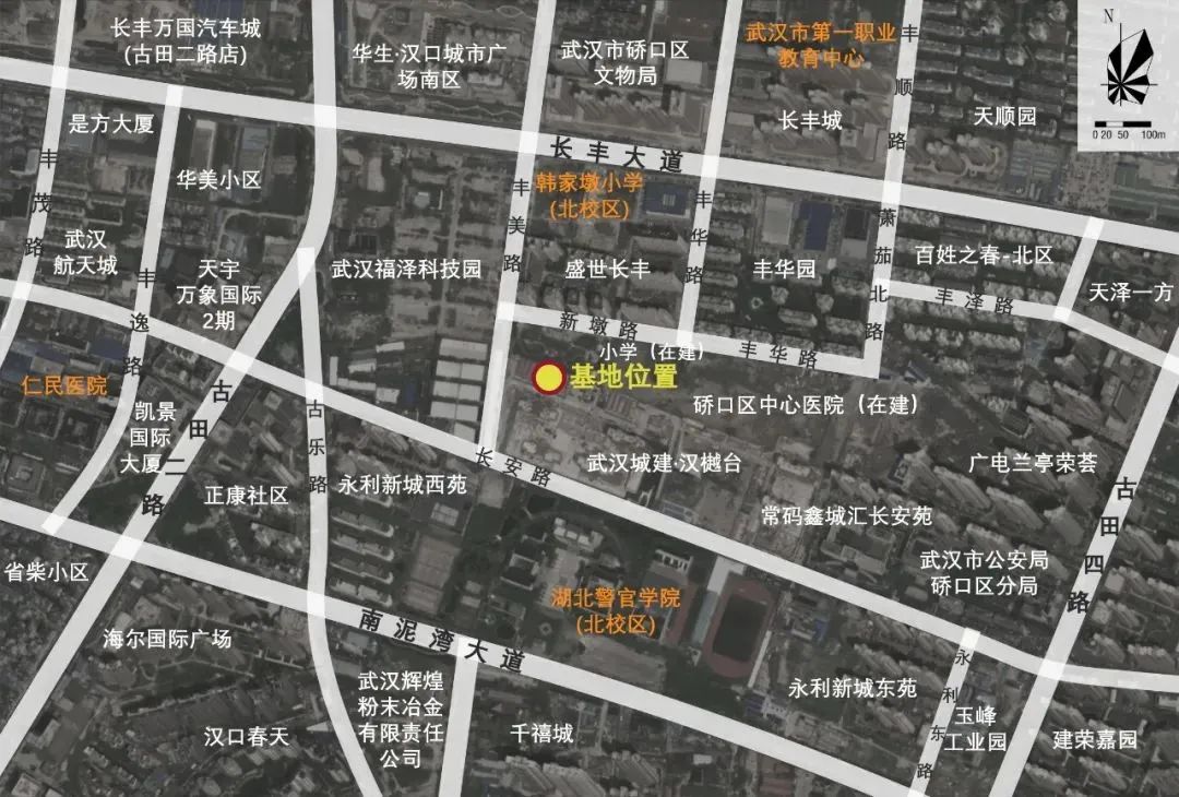 项目地块位于硚口区丰美路与新墩路交叉口东南侧,南邻武汉城建汉樾台,北邻丰美游园及小学(在建),东临规划道路,占地面积约17700平方米。基地周边以居住区为主,附近有硚口区中心医院(在建)、湖北警官学院等。基地现状为临时工地板房。