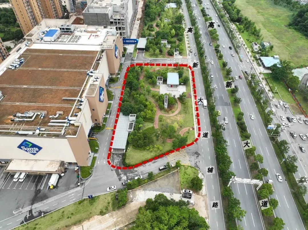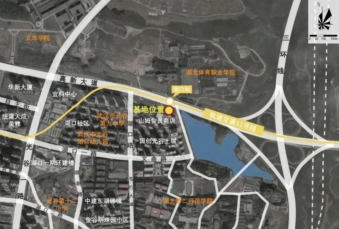 项目地块位于东湖高新区高新大道南侧,轨道交通11号线湖口地铁站C出入口前区,南邻山姆会员店,东临现状支路,占地面积约5610平方米。周边为居住区,配套有中小学、幼儿园,附近有湖北体育职业学院、文华学院、湖北第二师范学院等高等院校。现状为绿化广场,需整体改善提升。