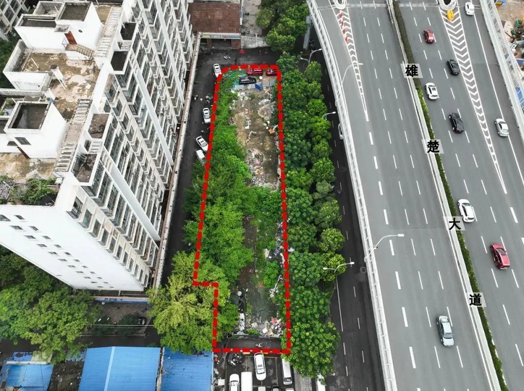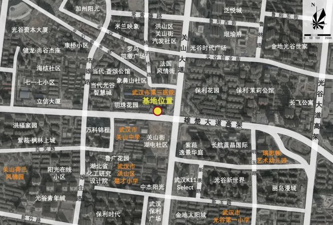 项目地块位于东湖高新区关山大道与雄楚大道交汇处西北侧,北邻保利花园3期,占地面积约1840平方米。周边以居住区为主,附近有武汉市关山中学、武汉市第三医院光谷院区,距离光谷步行街500米左右。基地现状为闲置用地。