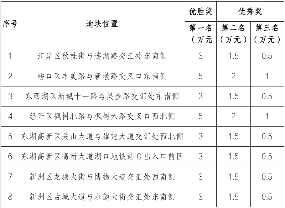 本次方案征集的每个点位分别设置优胜奖1个、优秀奖2个、入围奖若干。其中,优胜奖和优秀奖获奖团队颁发证书并给予设计奖金,入围奖获奖团队颁发证书。