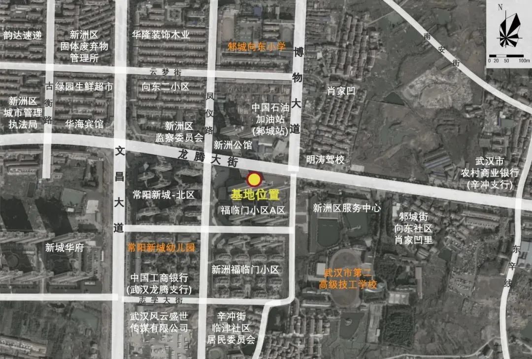 项目地块位于新洲区邾城街龙腾大街与博物大道(规划延长线)交汇处西南侧沿街带状绿地,南邻福临门小区,西邻公共停车场,占地面积约2920平方米。周边以居住区为主,附近有新洲区服务中心、新洲区监察委员会等政府机关、武汉市第二高级技工学校等。基地现状为闲置用地。