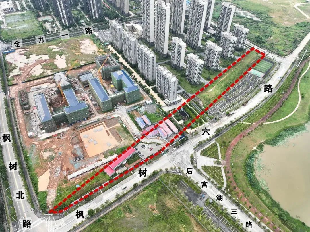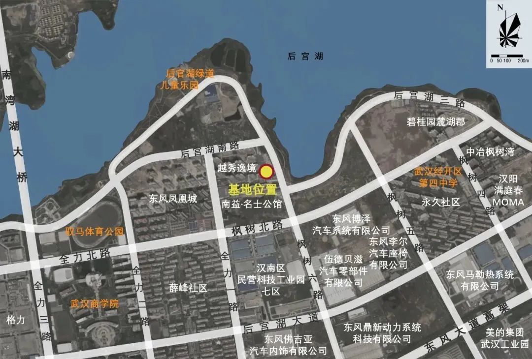 项目地块位于经开区枫树北路与枫树六路交叉口西北侧,西邻越秀逸境小区和薛峰中学(在建),占地面积约13200平方米。基地北半段与枫树六路之间建有对外停车场、篮球场和足球场;东部隔路与后官湖相望,生态环境优越;附近有体育公园、武汉商学院、后官湖绿道儿童乐园等公共设施。基地现状为闲置绿地和临时建设(现为接待中心和停车场)。
