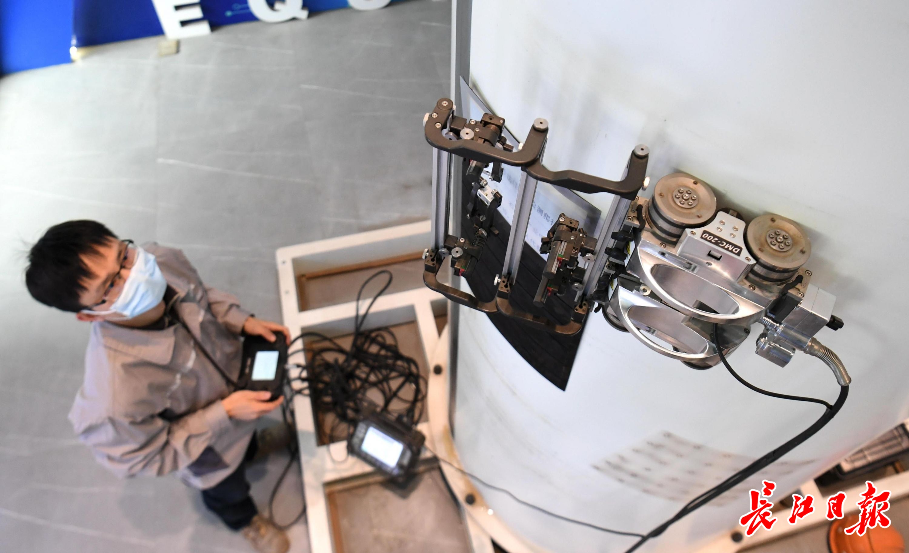湖北特种设备检验检测研究院,特检技术人员操作检测爬行机器人。长江日报记者高勇 摄