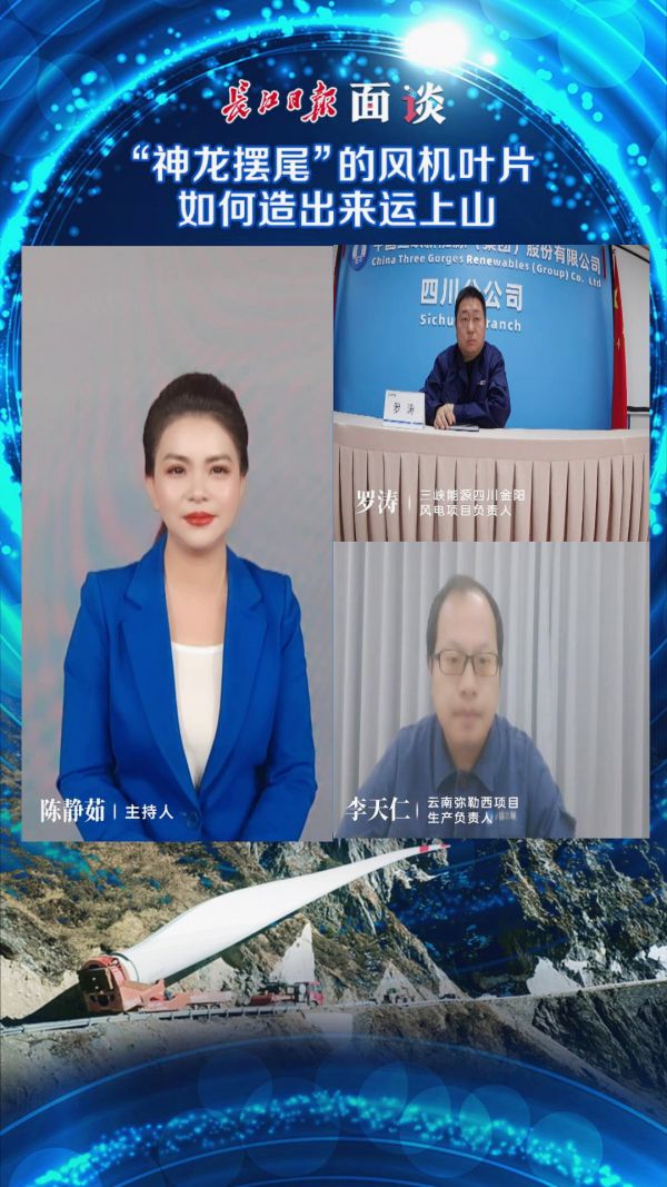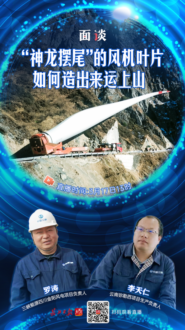长江日报大武汉客户端3月17日讯 日前,在三峡集团所属三峡能源四川金阳风电场,建设者将75米长、19吨重的风机叶片运送上山的视频在网上爆火。3月17日,三峡能源四川金阳风电项目负责人罗涛和三峡能源云南分公司弥勒西项目负责人李天仁做客长江日报《面谈》栏目,为广大网友揭秘大风车“神龙摆尾”背后的故事。