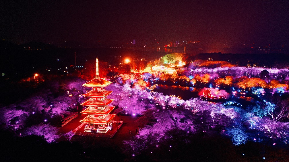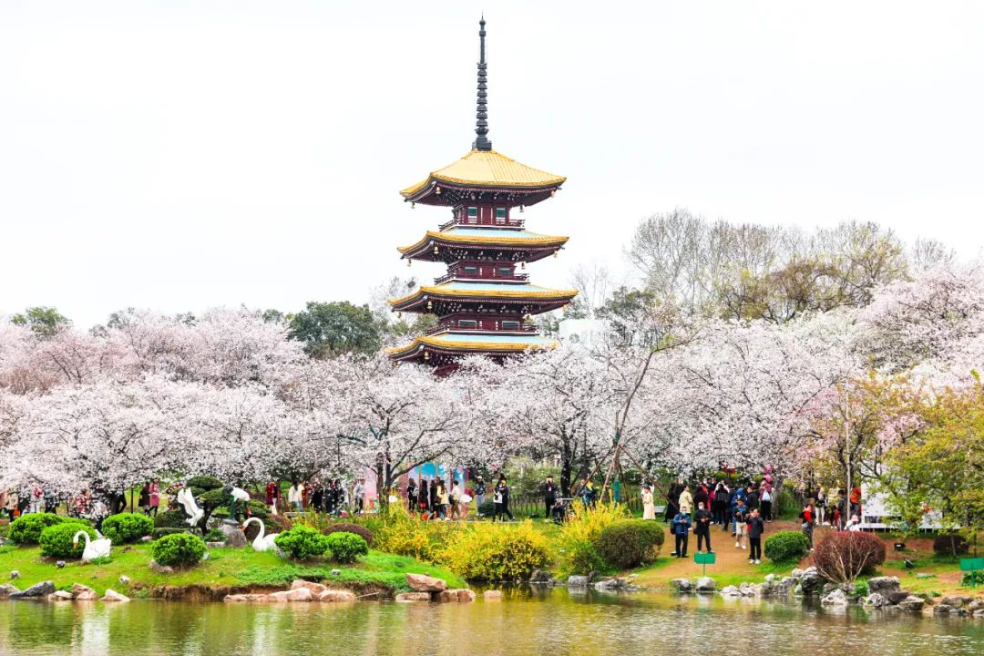 东湖樱花园标志性建筑五重塔、曲院樱艳和樱花海相互映衬。景区供图