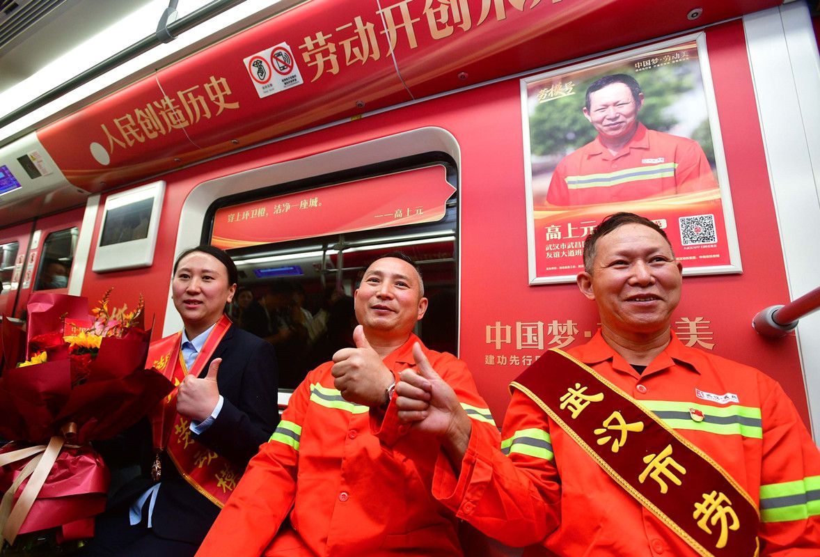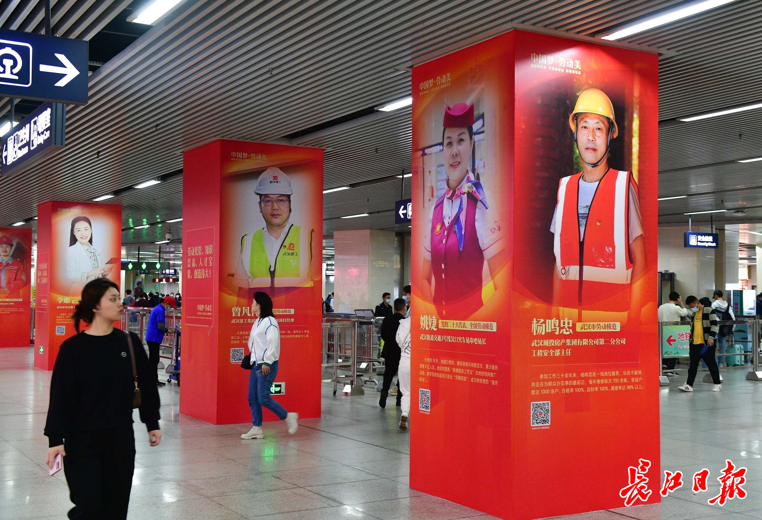 在地铁汉口火车站、洪山广场站,省市劳动模范和先进工作者的巨幅海报集中亮相地铁站厅和站台,吸引不少路过乘客驻足观看拍照。