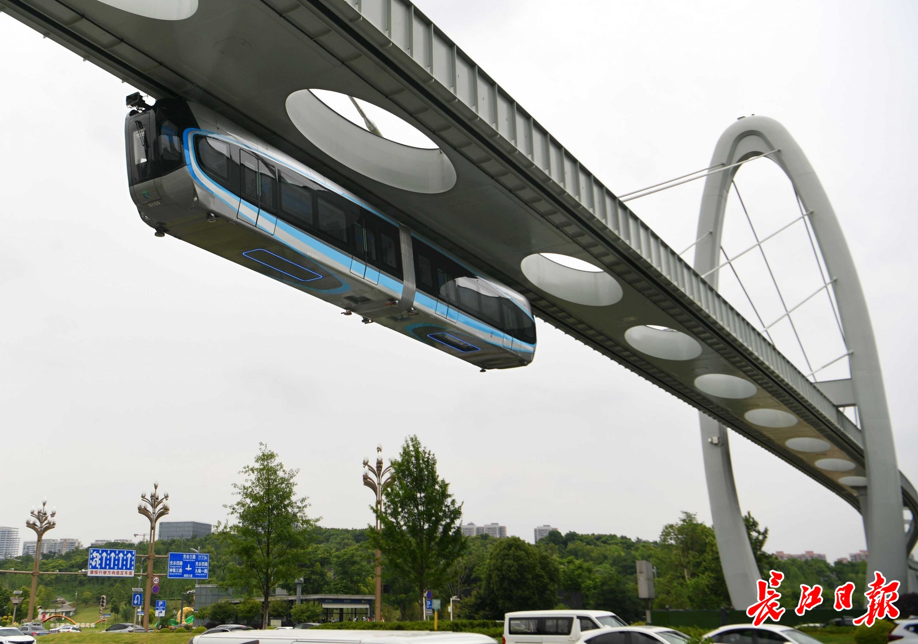 行走在高新大道光谷四路附近,行人偶尔抬起头,会看到一辆“科技蓝”的列车悬在空中飞驰而过,科幻感十足,这便是光谷空轨。