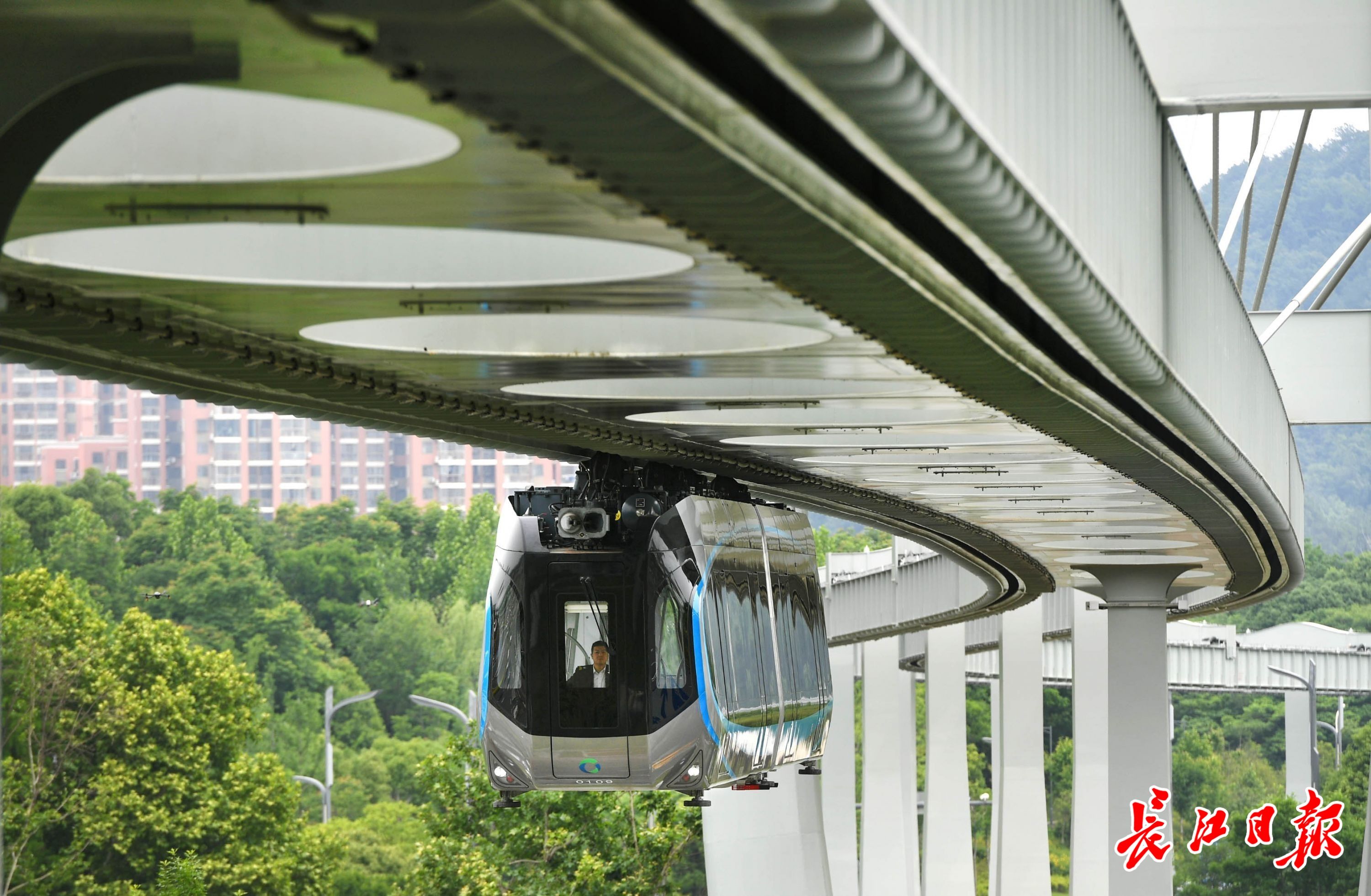 “光谷光子号”空轨奔驰在光谷生态大走廊。 长江日报记者高勇 摄