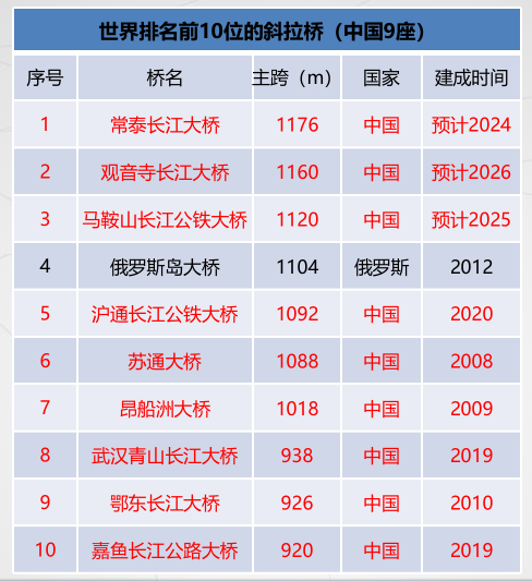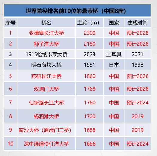 长江日报大武汉客户端6月15日讯(记者王谦 通讯员刘新华)15日,记者从世界交通运输大会第五届桥梁发展论坛中获悉,世界大跨度桥梁跨径排名前10的悬索桥,中国占据8座;世界大跨度桥梁跨径排名前10的斜拉桥,中国占据9座。中国桥,穿云跨海,适应各种复杂建设条件,总量近百万座,数量和技术均走在了世界前列。
