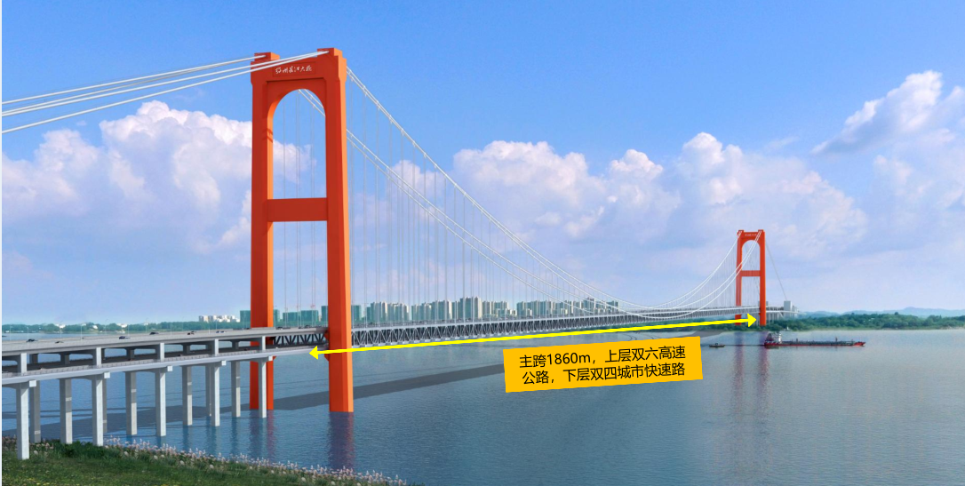 在建的武汉至松滋高速公路江陵至松滋段观音寺长江大桥,主跨跨径达1160米,是世界第一大跨径公路斜拉桥,设计者首次将钢-UHPC组合梁应用于超千米主跨斜拉桥,斜拉桥的主梁自重较传统组合梁设计方案减小约20%。