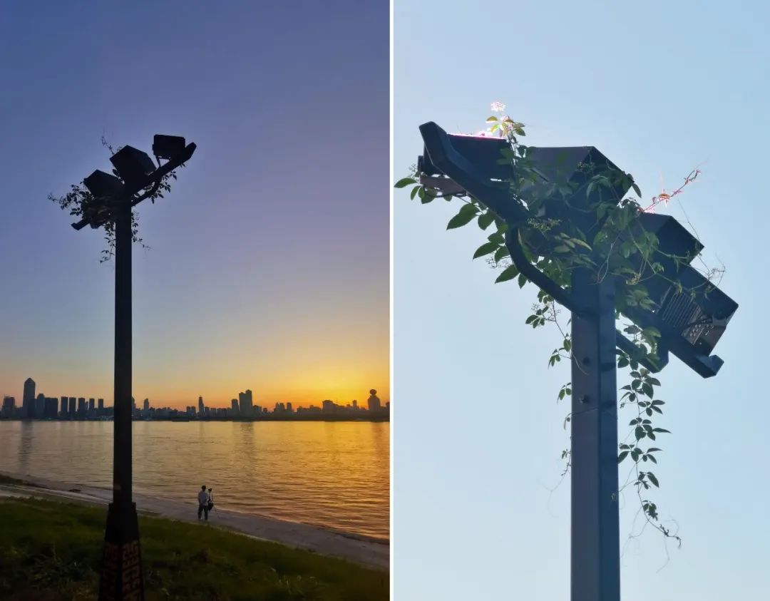 武昌江滩月亮湾段江边的景观灯杆上,生长着一株鲜活的蔓草,它是从灯杆里面通过自己不懈的努力攀爬最终从顶端探出了头,还分枝散叶且开出了一朵朵小白花,这就是生命的力量!你看,只要努力,小花也有出头之日!