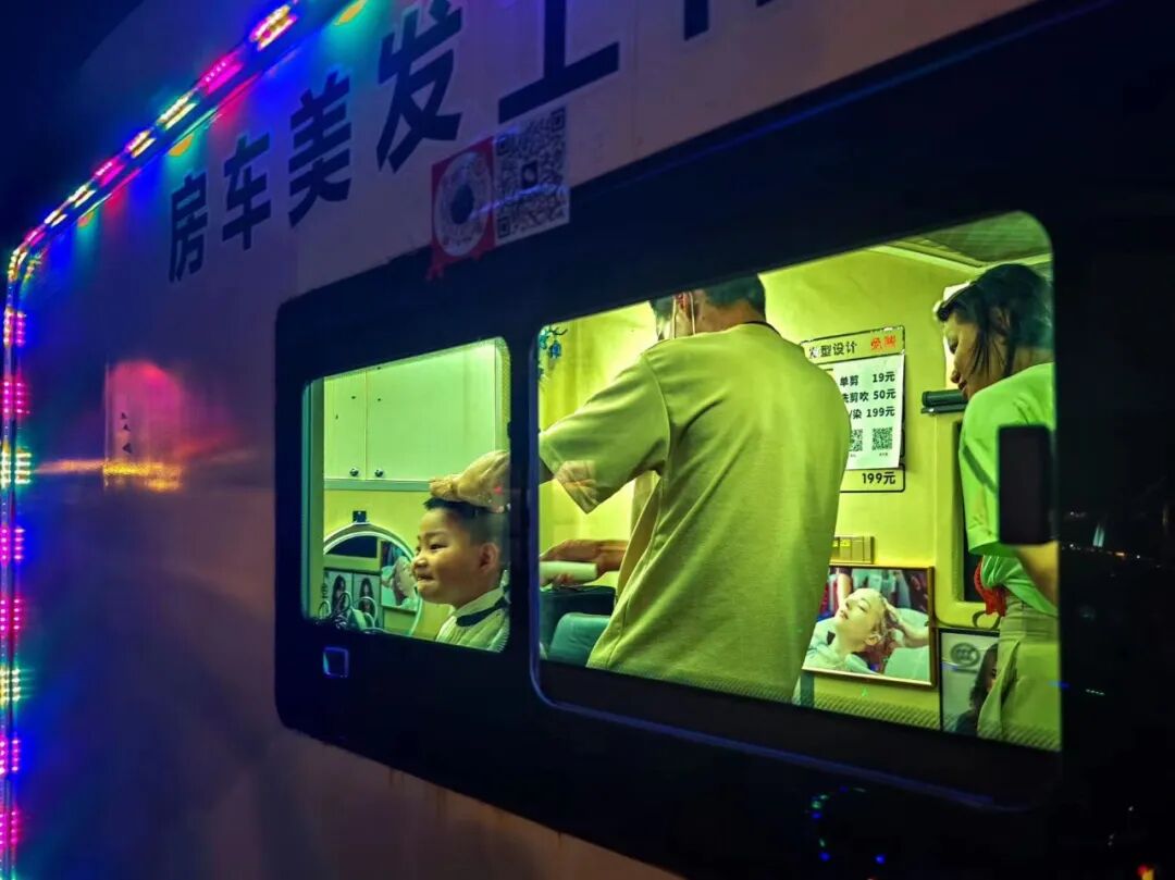 那天,像往常一样,我到江滩散步消食。夜晚的江滩很热闹,有一辆白色房车框架上镶着一圈彩灯,在夜里闪闪发光非常炫目,吸引了我的注意。我走近看看,发现这竟然是一家“移动理发店”!车身上贴着“房车美发工作室”几个大字,一些理发元素的小贴纸十分漂亮。