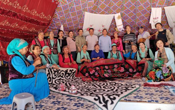 在博乐市阿热勒托海牧场,武汉艺术家一行循着“新疆是个好地方”的音乐旋律走进阿热勒托哈村蒙古包,身着民族服饰的当地民众立即上前迎客,请大家吃糕点、喝奶油茶。
