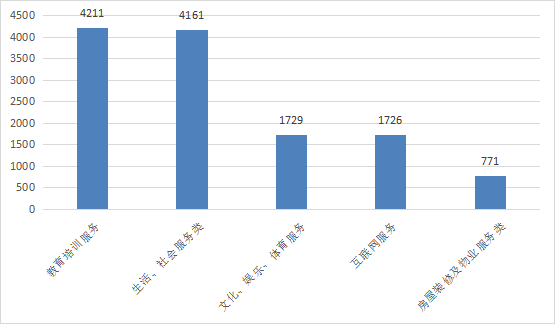 2023年上半年,湖北省消委组织受理服务类投诉14765件,占投诉总量45.14%。其中,教育培训类4211件,占服务类投诉总量的28.52%,位居服务类投诉第一。生活社会服务类、文娱体育服务类、互联网服务类、房屋装修及物业服务类的投诉量位居第二至第五(如图2)。