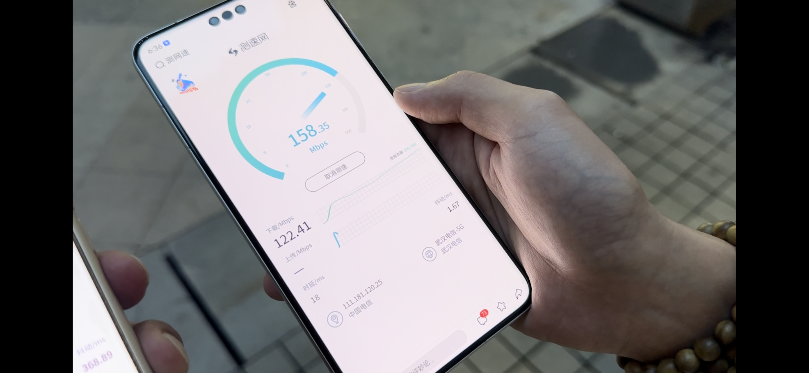 开机后,记者发现华为Mate 60 Pro插卡后在信号栏上方并未显示到底是“4G”还是“5G”,但随后打开网速测试网页,网页上显示为“武汉电信5G”,在人群密集的光谷步行街已达到5G网速,速度为158Mbps。