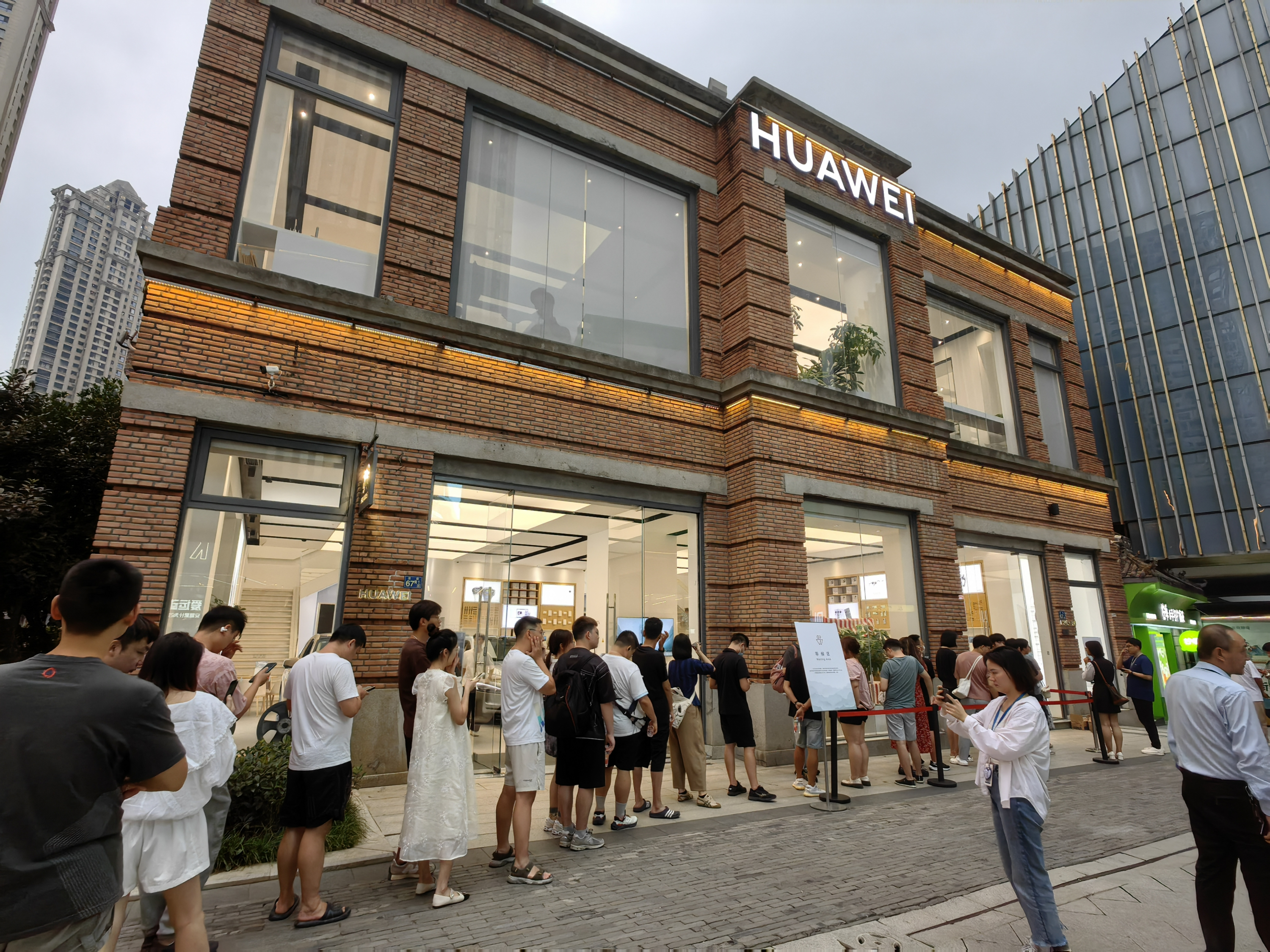 在武汉,华为方面已通过电话、短信形式通知早前参与线下预售的用户,前往线下直营门店领取新机。长江日报记者在楚河汉街店铺看到,排队人群排到步行街上了。