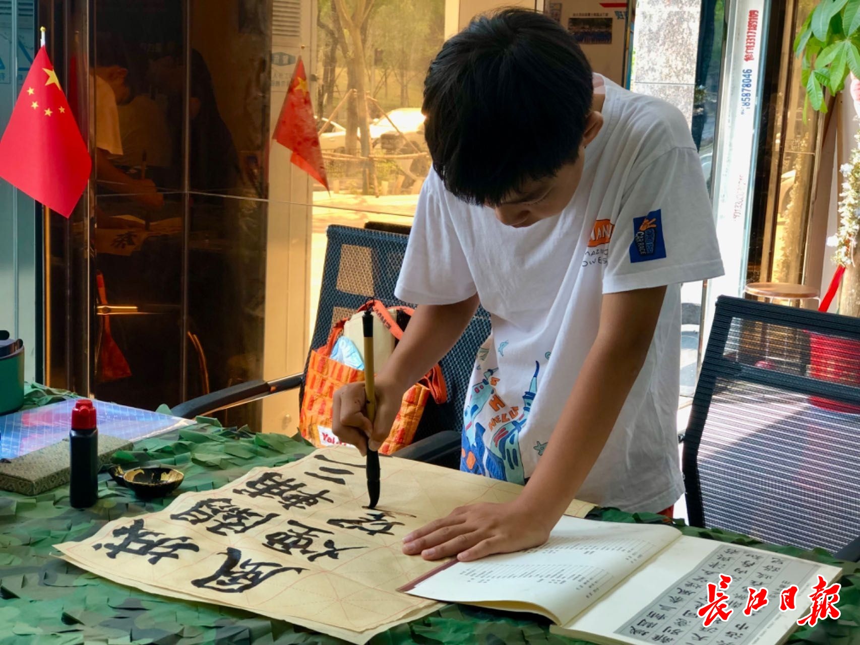 蒋晓纬在红旗渠路蓝骑士驿站练习书法。长江日报记者张珺摄