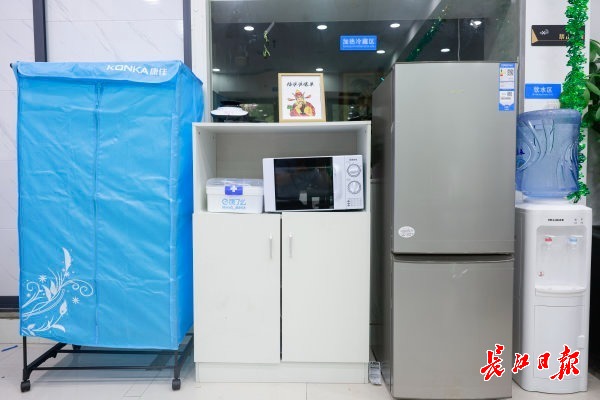 在驿站,张宝剑配置了冰箱、微波炉、饮水机、烘干柜、应急急救箱等,为骑手们提供生活便利。长江日报记者 胡冬冬 摄