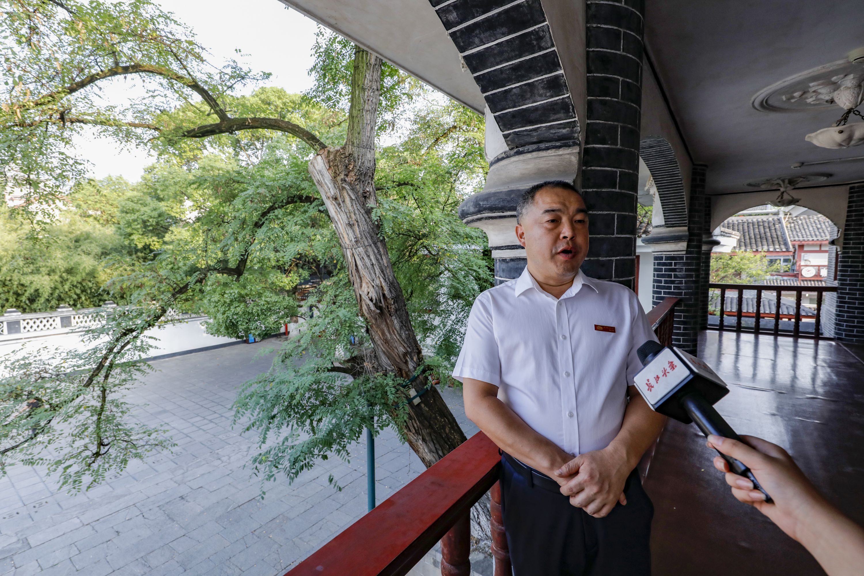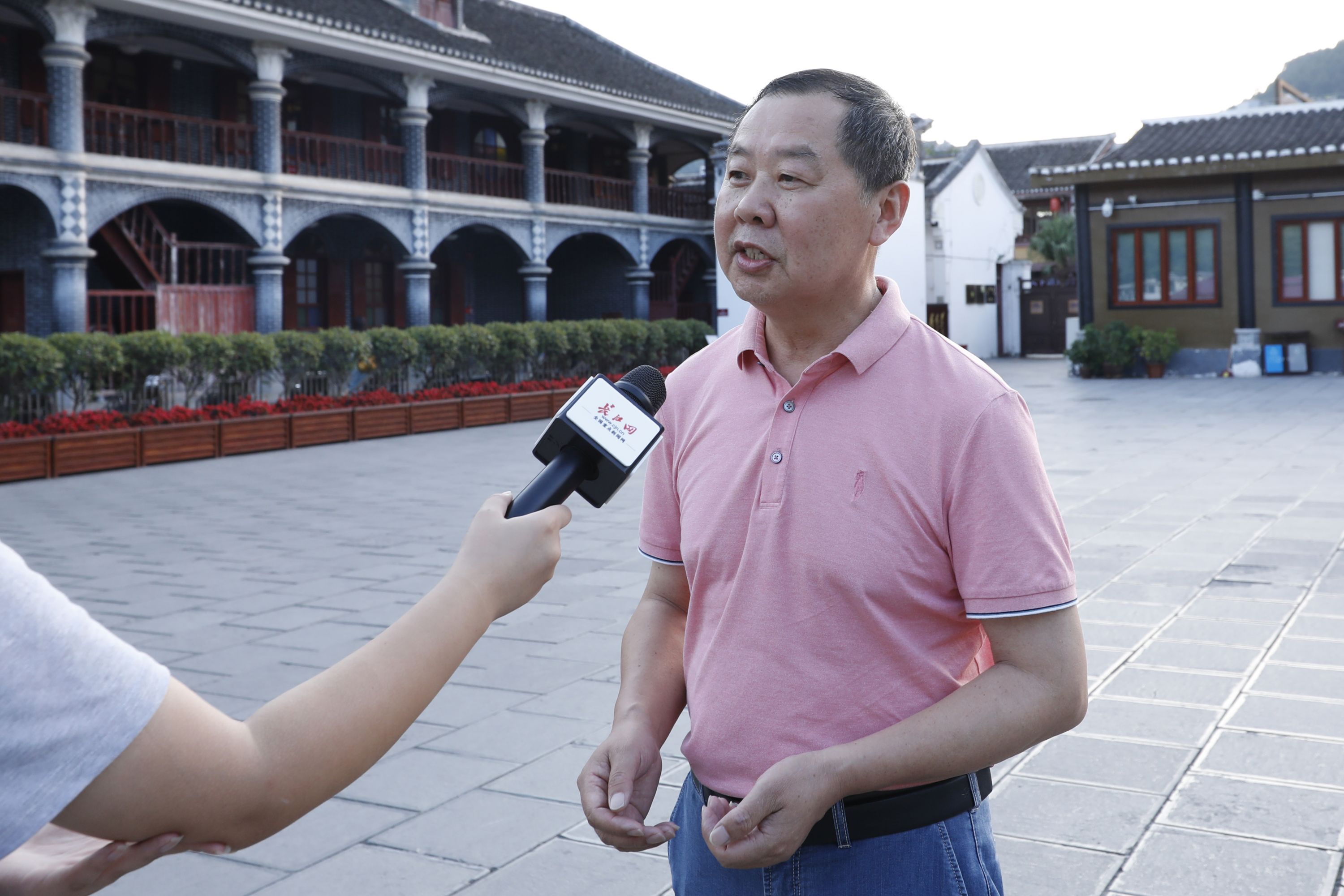 遵义会议会址前,“沿着长江读懂中国——万里长江行”贵州段探访团特邀专家、湖北省文物考古研究院二级研究员陈树祥接受记者采访。 王筝 摄