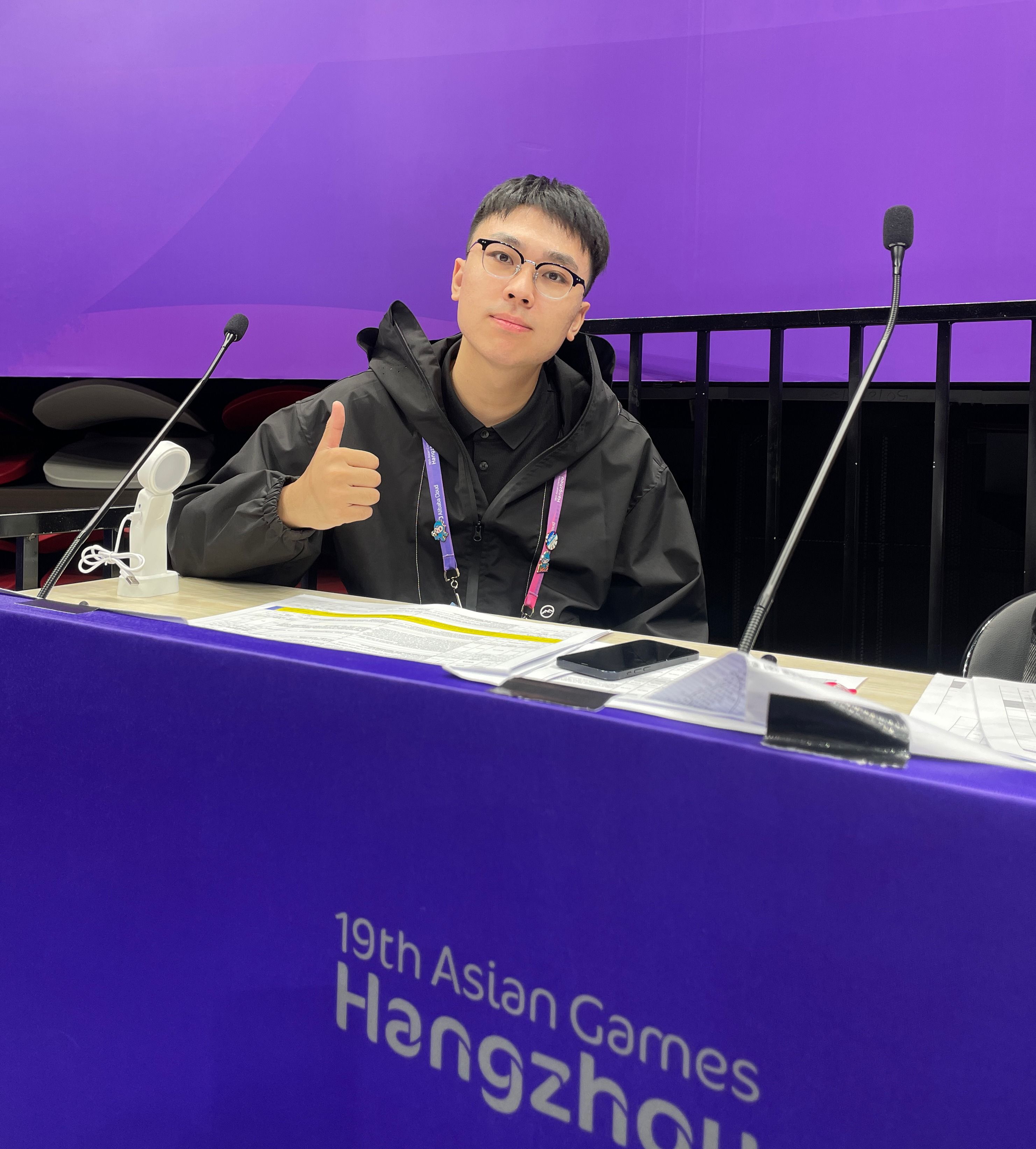 肖天宇:在本届亚运会中,我主要在乒乓球、霹雳舞项目场馆负责中文播报。工作中,中文播报员与英文播报员相互搭配。播报工作主要分为赛前播报:温馨提示、对项目的介绍、对场馆的介绍、无线电的须知等;赛中互动:主要是充当MC的角色,与观众互动;赛后播报:颁奖环节。