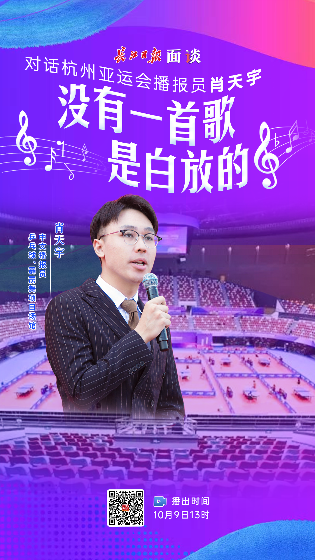 杭州亚运会闭幕,中国选手创历史佳绩,同样走红的还有官方“气氛组”。不少网友都对场馆里的音乐和播报效果啧啧称赞,并亲切地称比赛场馆内的服务团队为“会整活儿的官方气氛组”。10月9日,本届亚运会乒乓球、霹雳舞项目场馆中文播报员肖天宇做客《面谈》,讲述官方“气氛组”背后的故事。