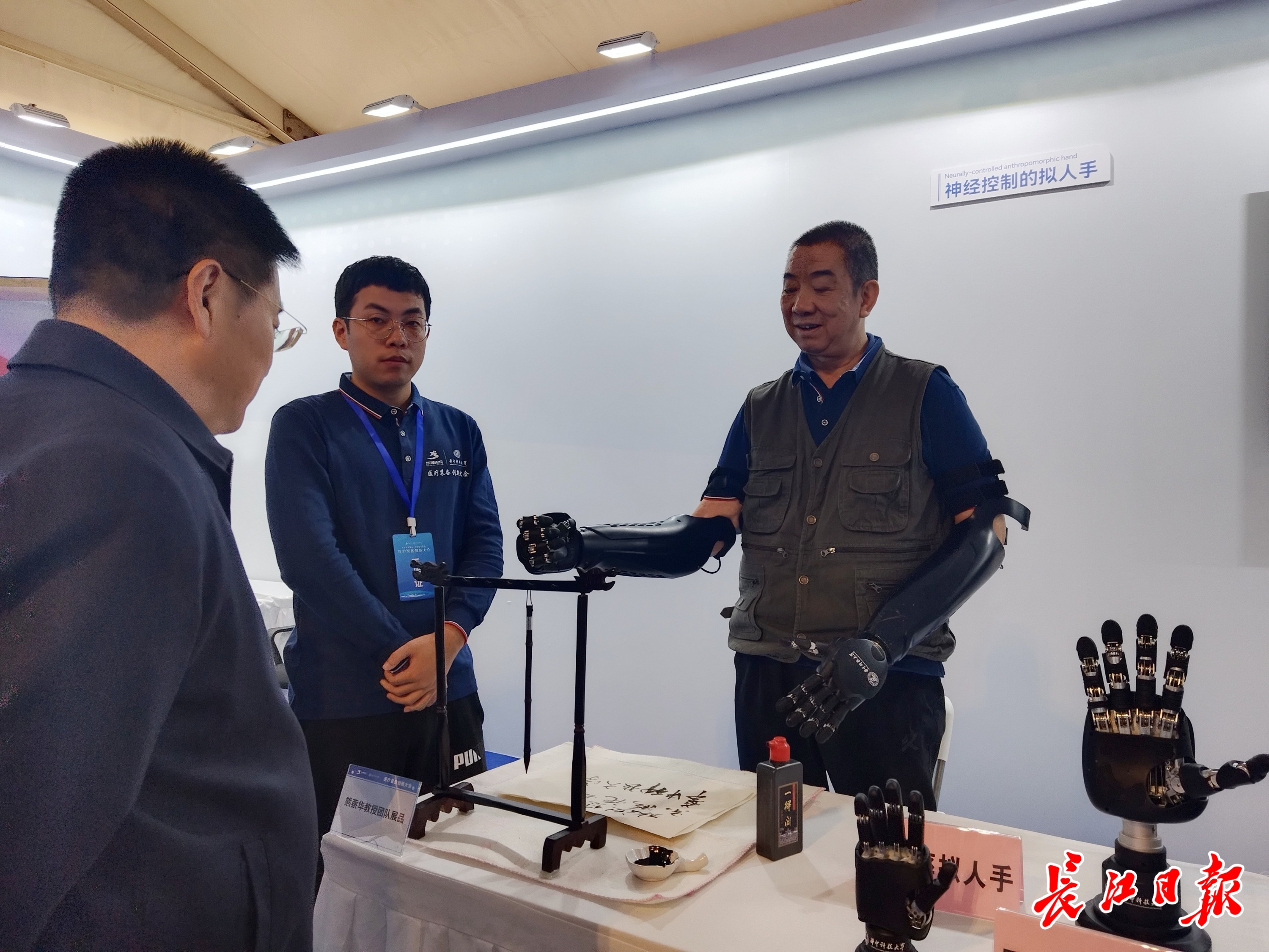 展会上,一款“神经控制的拟人手”也受到众多参观者的关注。一位手部缺失的工作人员现场戴着拟人手进行了功能展示,只见他用拟人手从笔架上取下毛笔,握笔轻松写下“华中科技大学欢迎您”。