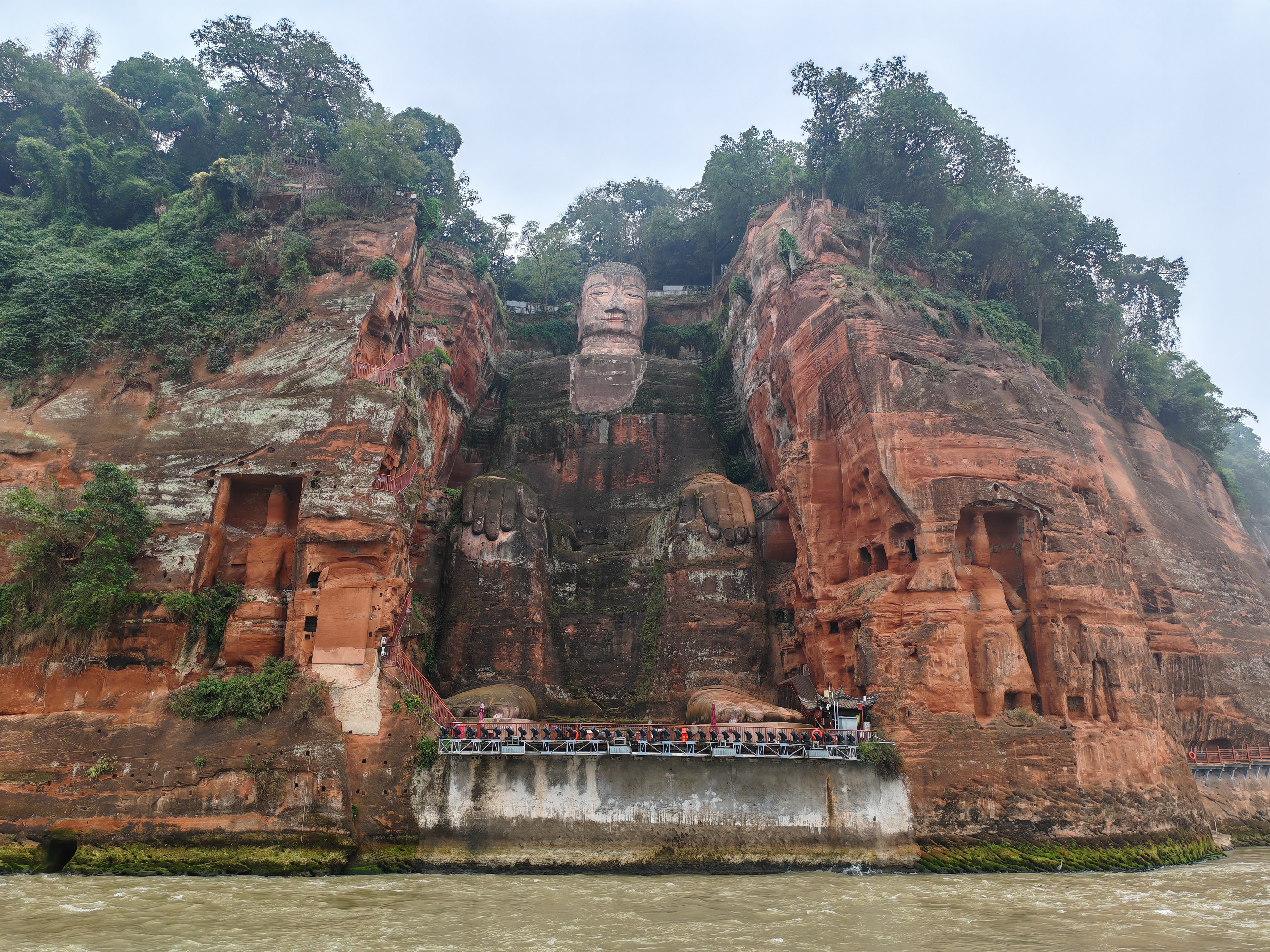 彭学艺告诉探访团,因岩体维护,大佛一侧的凌云栈道暂停开放,记者便乘船行至大佛面对的江上。乐山大佛头与山齐,通高71米,相当于23层楼高,记者在此仰望大佛,真有仰之弥高的感觉,在倚山而立、面江而坐的大佛面前,人显得十分渺小。