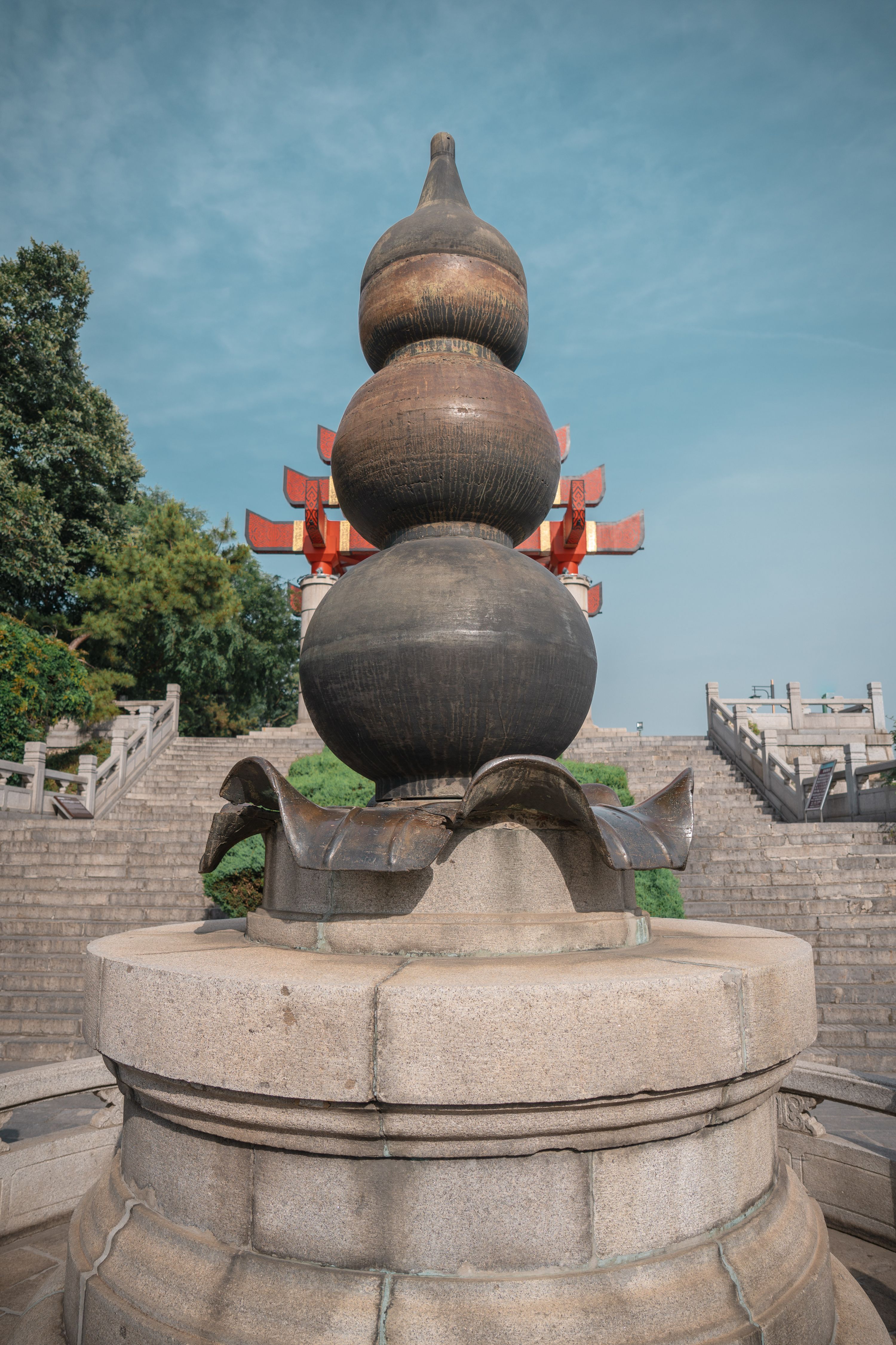 宝顶,是中国传统建筑装饰,它一般位于建筑顶部中心,尤其是攒尖式屋顶的顶尖处。宝顶的形状或是多少个圆球堆叠,或是单纯的圆珠或圆柱。今天的黄鹤楼“宝顶”,类似于宝葫芦状。而位于黄鹤楼前的古铜顶为一般不可移动文物,是同治楼毁于火灾时幸存下来的宝铜顶,见证了这座城市的沧桑变迁。