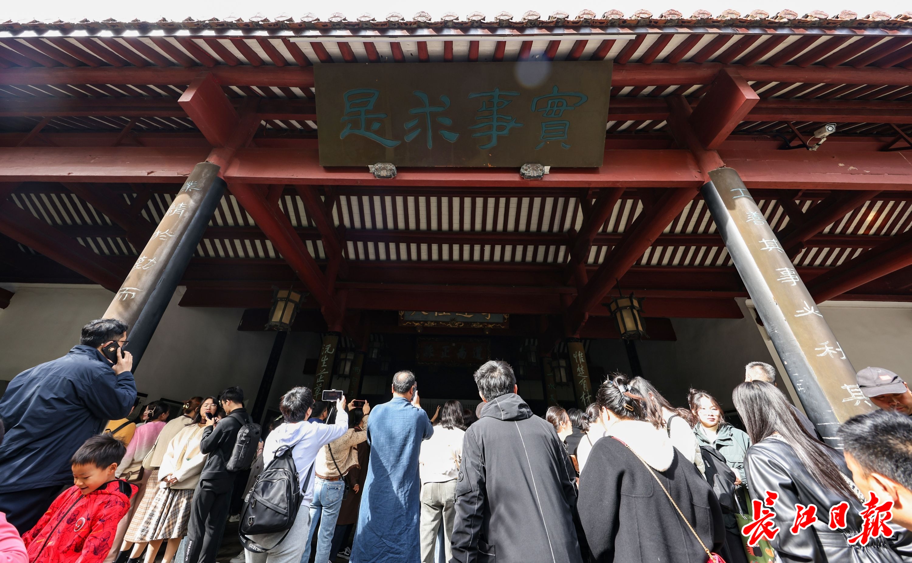 “实事求是最早见于《汉书·景十三王传》,意在称赞河间献王刘德注重实证的治学风格。”岳麓书院讲解员介绍,1917年湖南公立工业高等专门学校迁入岳麓书院时,时任校长的宾步程亲撰此匾,并将其作为校训,引导学生尊重事实、崇尚科学、追求真理。