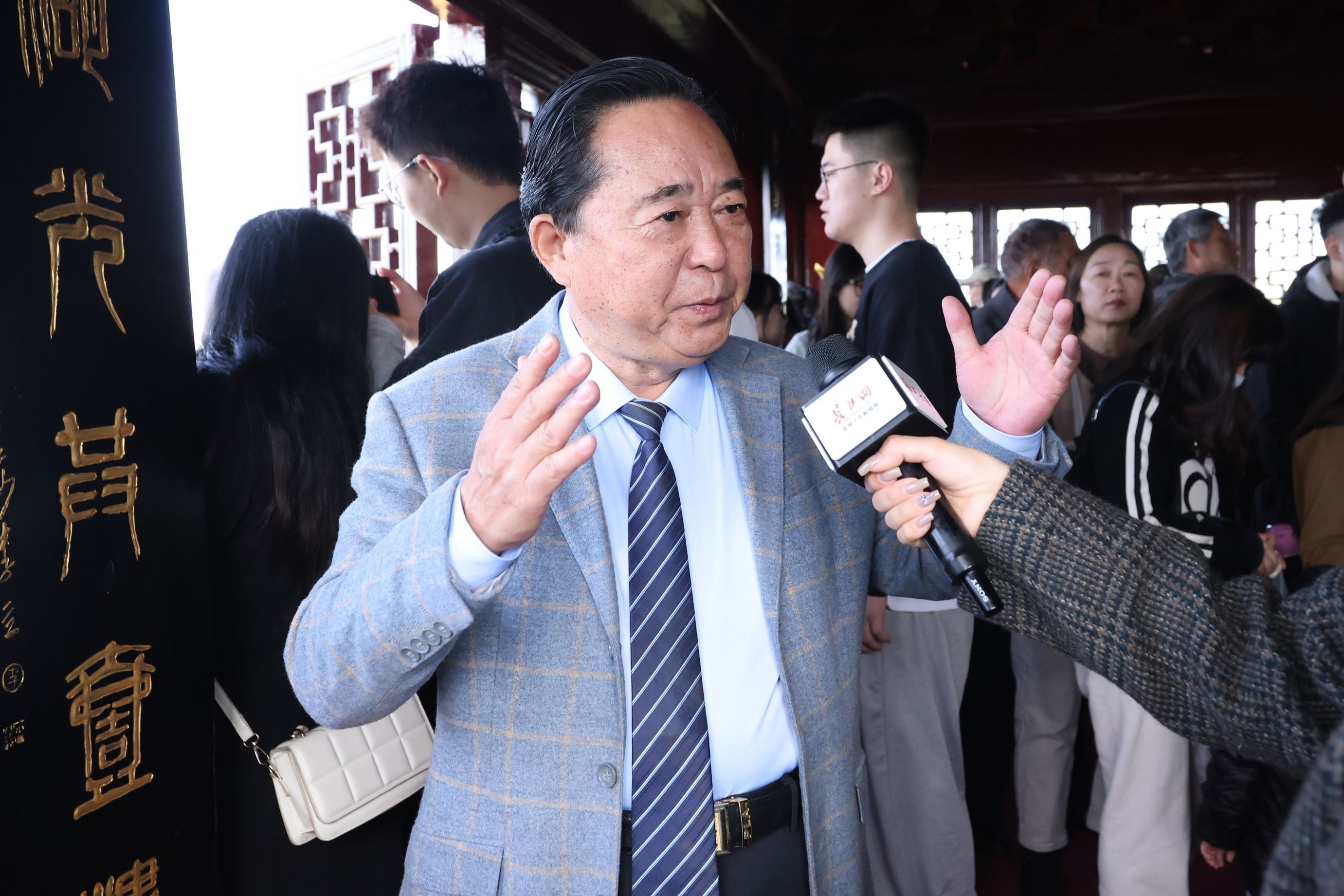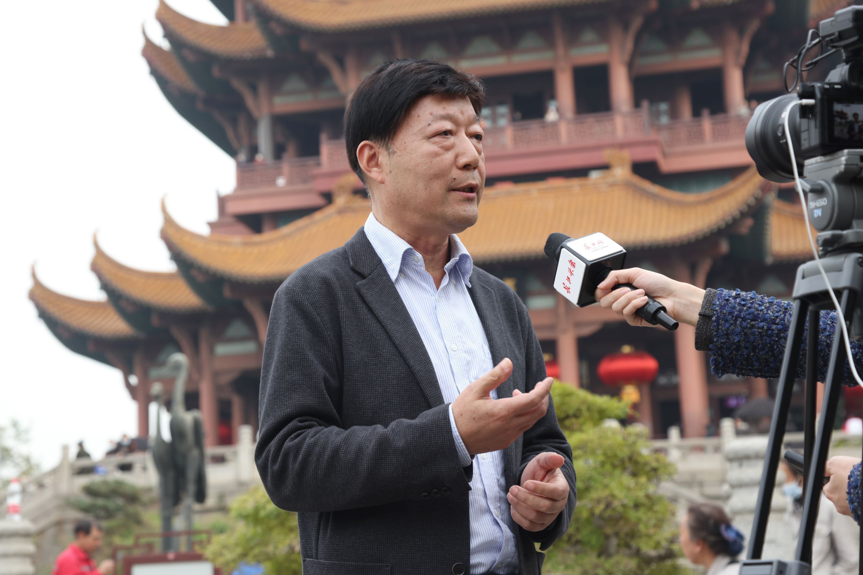 武汉大学哲学学院教授、《黄鹤楼志》副主编钟年接受探访团记者采访。探访团成员王筝 摄