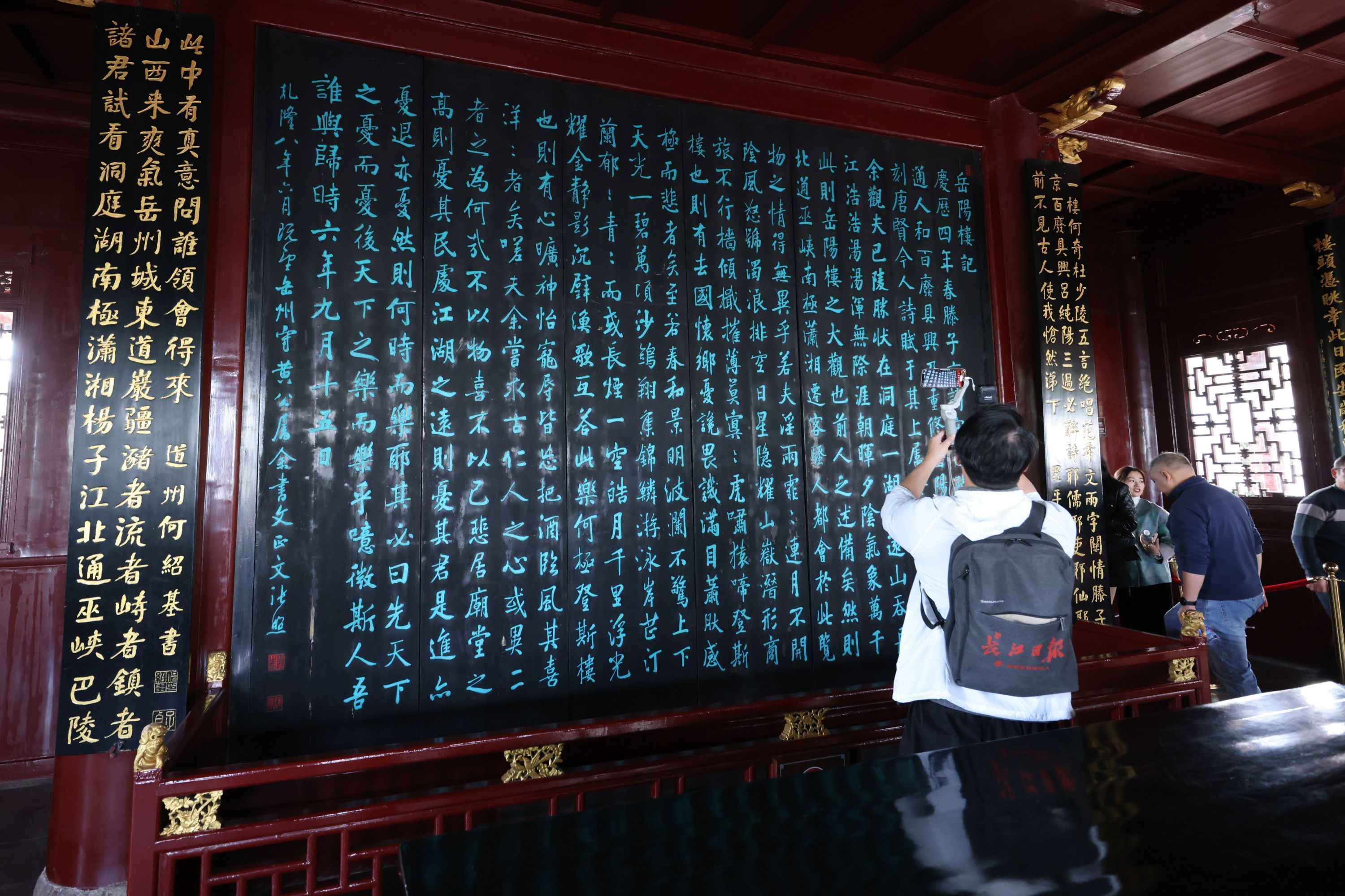 探访团成员在岳阳楼内品读《岳阳楼记》。探访团成员王筝 摄