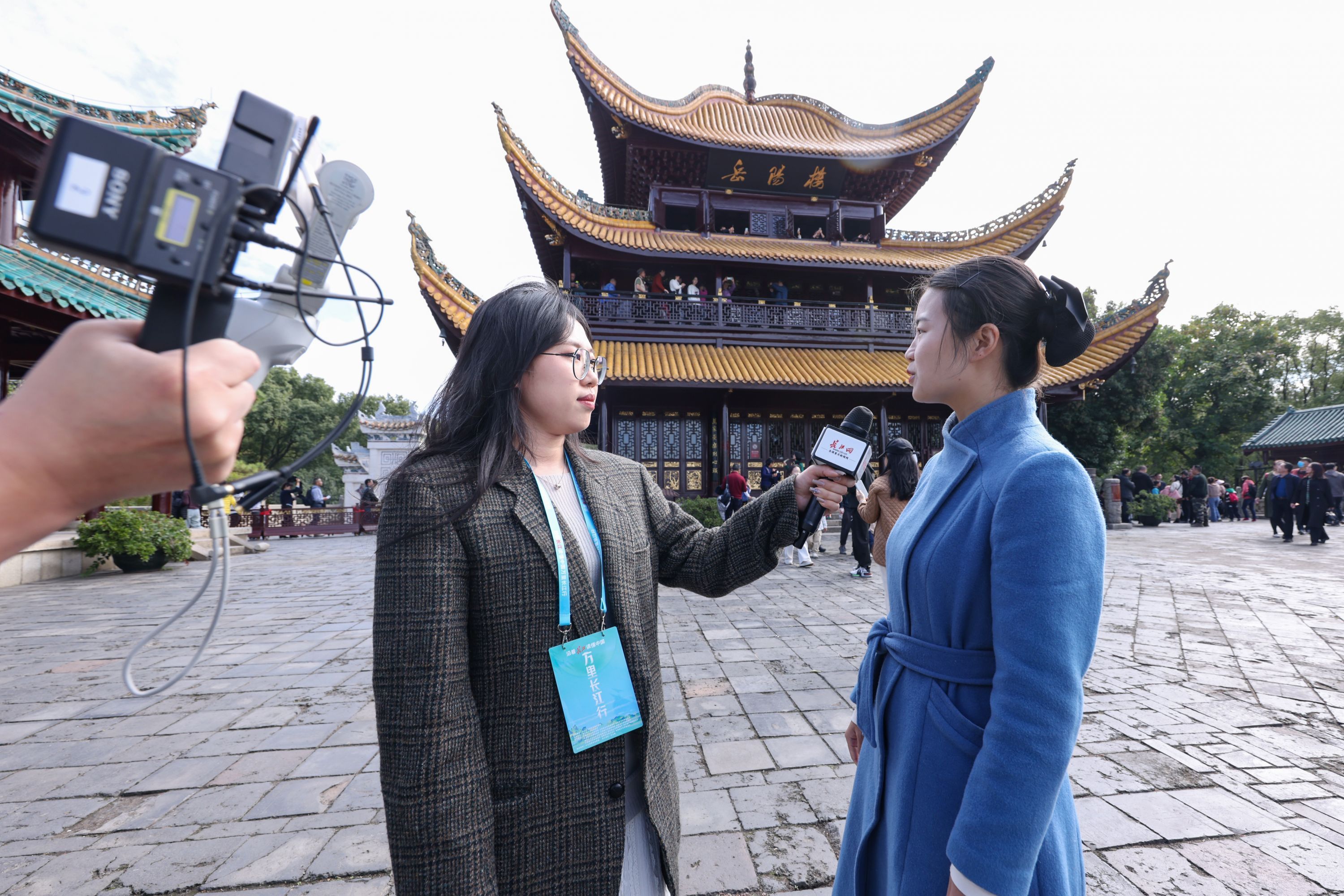 探访团一行在岳阳楼进行现场直播,讲解员肖湘蓉细说岳阳楼历史传承。探访团成员王筝 摄