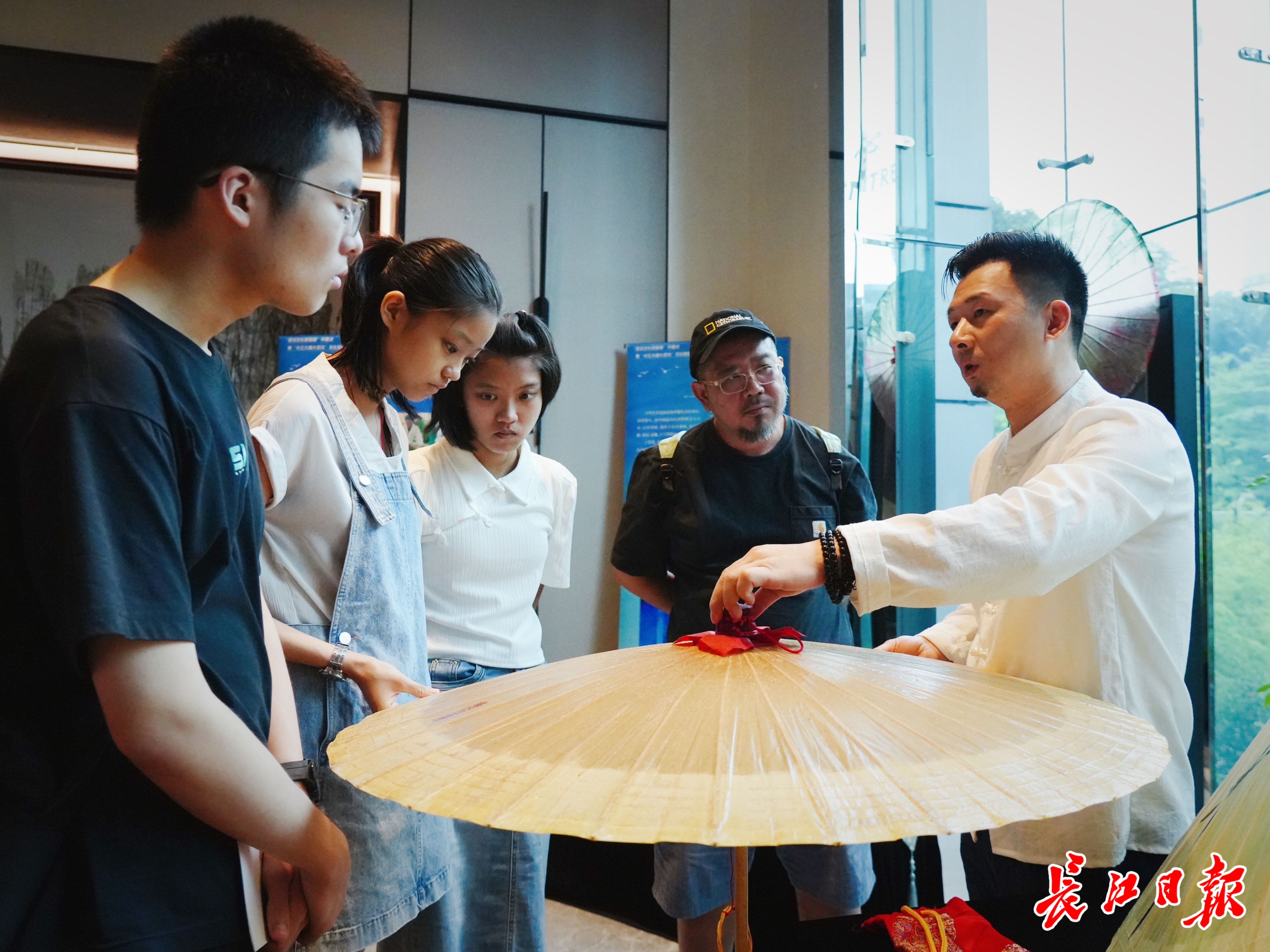 “这把伞能不能出售给我?”在2023“武汉文化旅游周”活动现场,马来西亚民众纷纷向非遗传承人苏峰求购。苏峰介绍,“苏恒泰”创立于1864年,“恒泰”取长久安康之意,至今已有150余年历史。苏恒泰油纸伞集各地制伞精华工艺于一身,是中国现存最老的油纸伞品牌。“油纸谐音‘有子’,撑开一把油纸伞,象征着天人合一的东方思想。”听到苏峰的介绍,马来西亚观众对这把有文化的伞更加追捧。