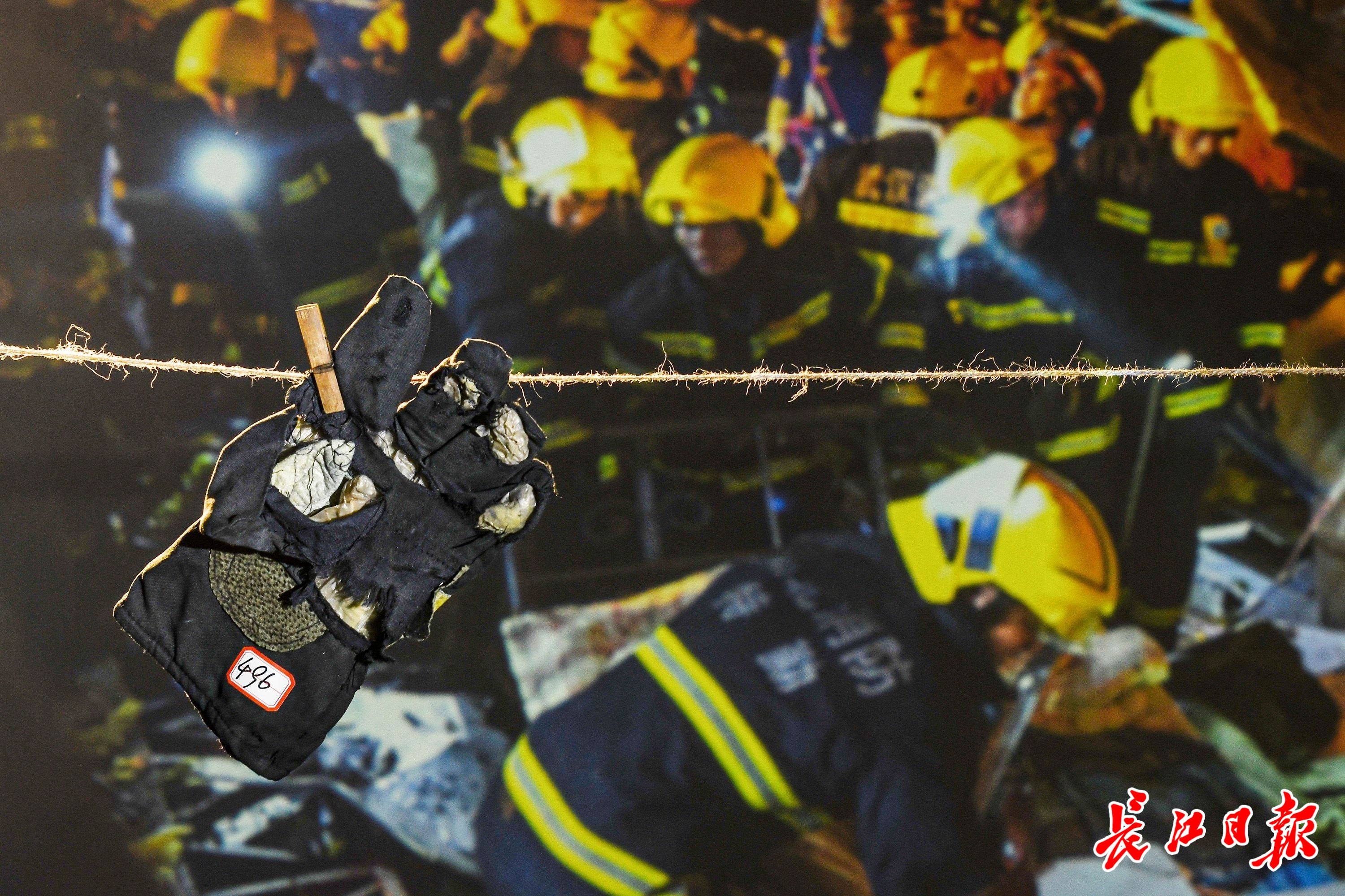 编号496手套展示在2021年5月14日武汉市蔡甸区突发龙卷风灾害救援现场的照片前。这是消防员当时使用过的手套。