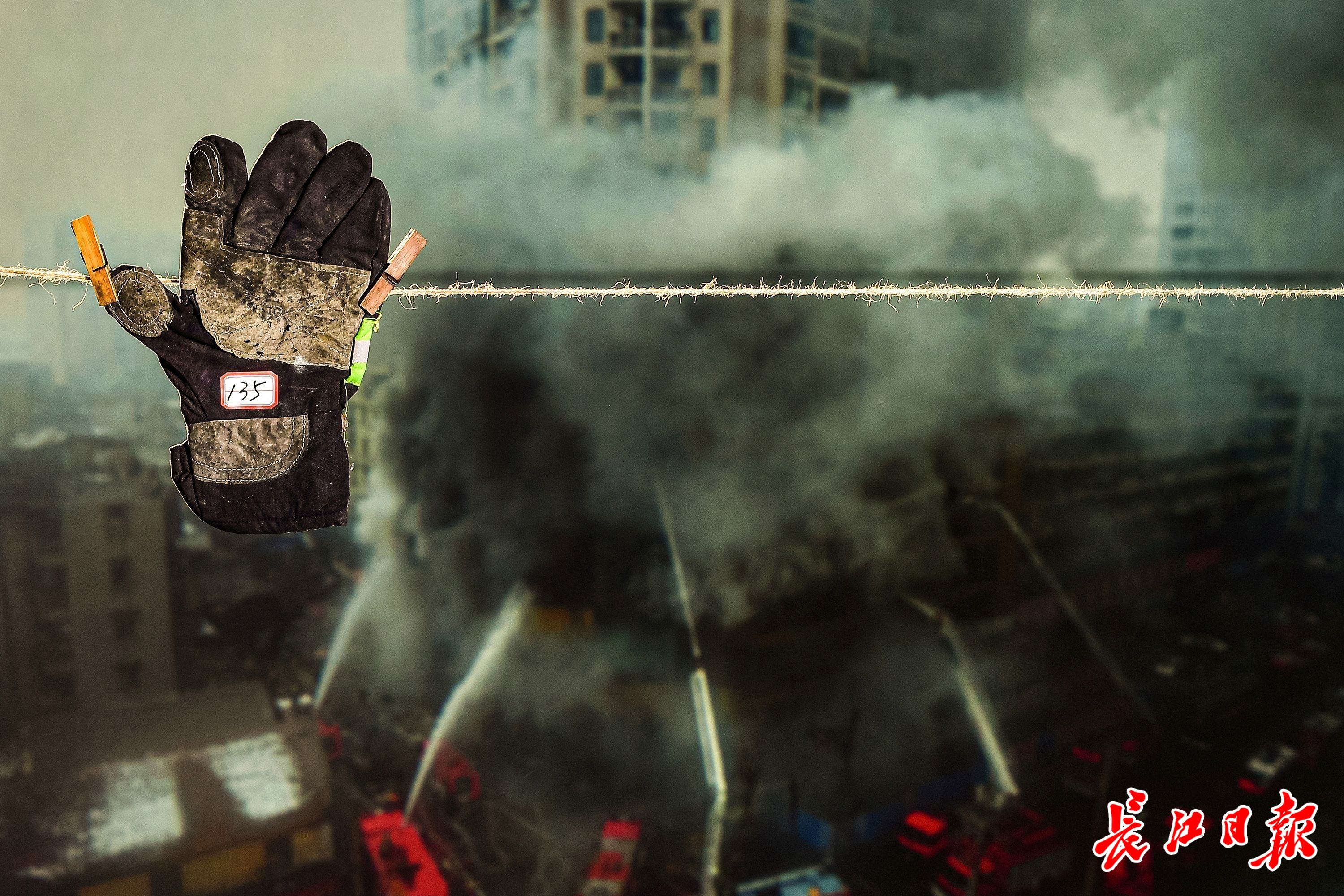 编号135手套展示在2010年1月8日武汉市汉正街大火救援现场的照片前。这是消防员当时使用过的手套。