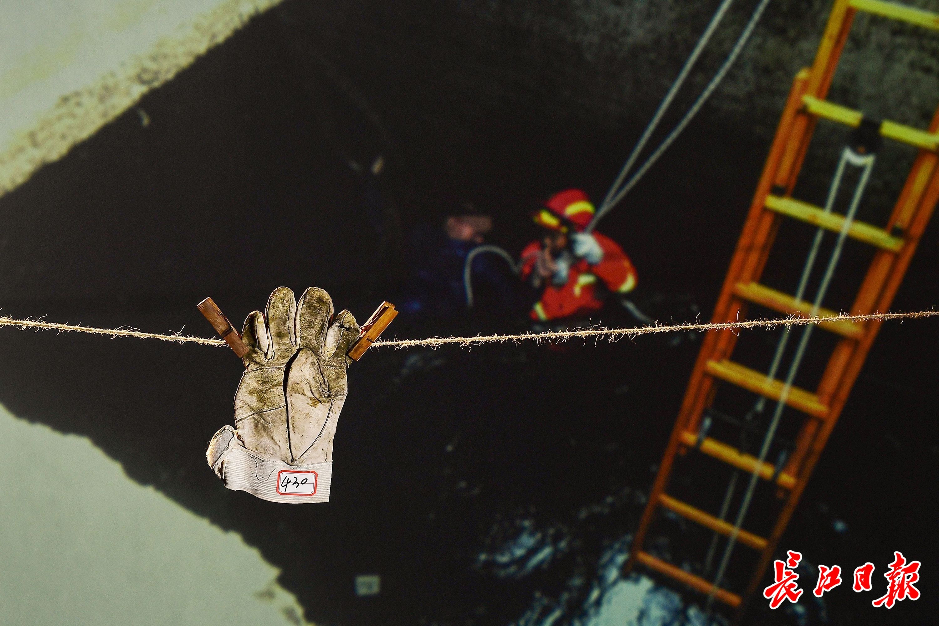 编号430手套展示在2019年12月20日武汉江汉大学教师坠井救援现场的照片前。这是消防员当时使用过的手套。