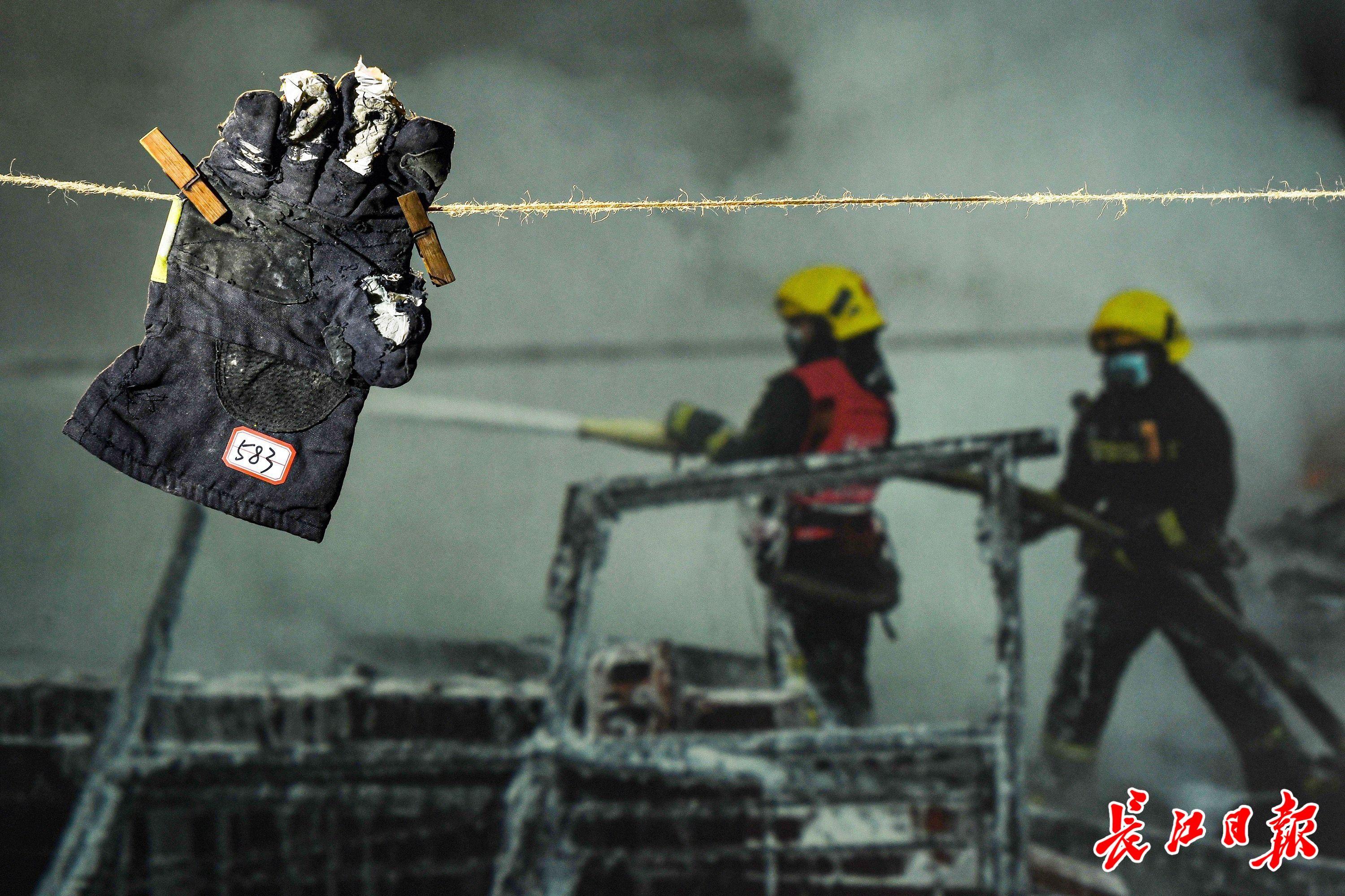 编号583手套展示在2022年12月8日武汉市恒钢物流公司火灾救援现场的照片前。这是消防员当时使用过的手套。