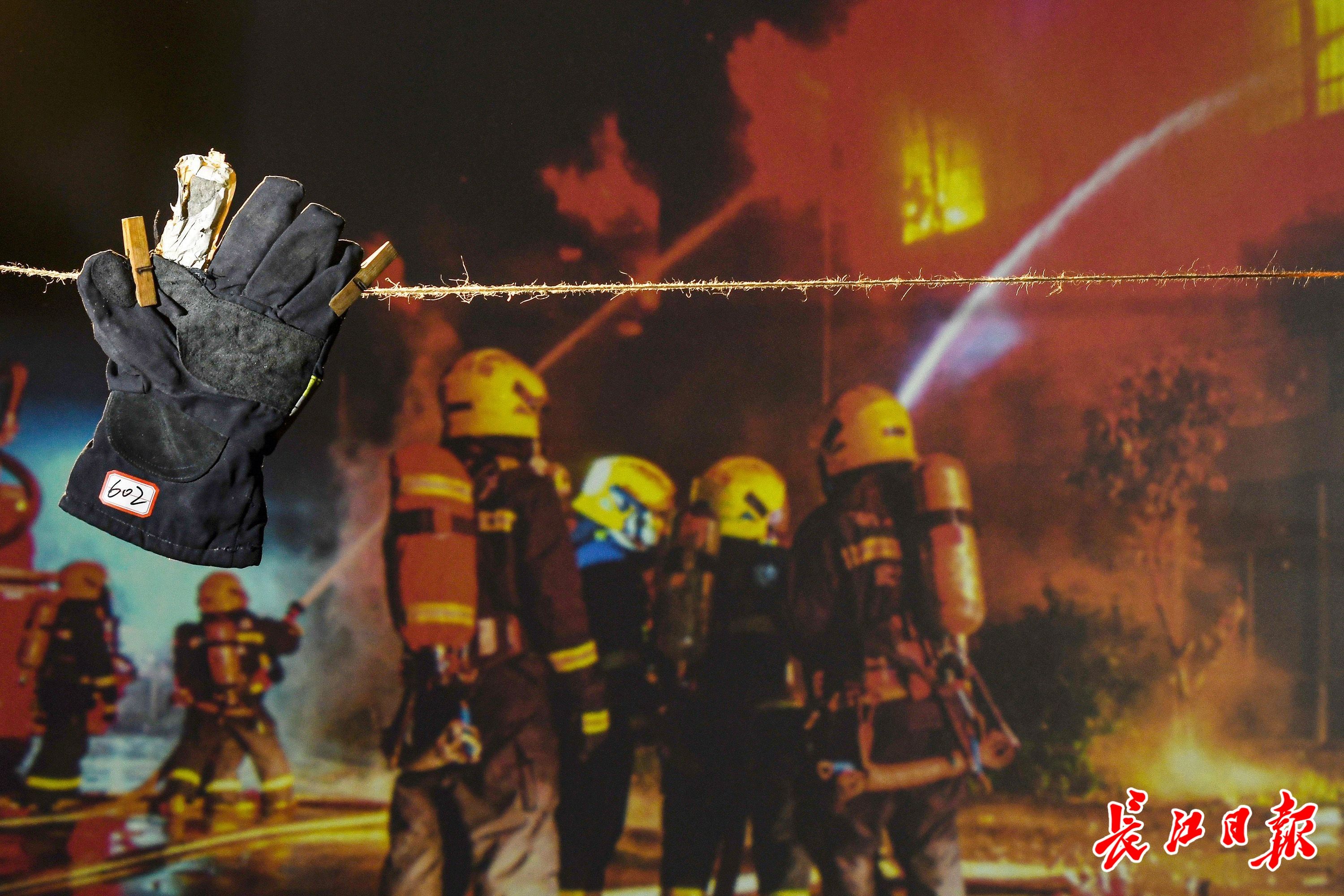 编号602手套展示在2022年12月24日武汉市一厂房火灾救援现场的照片前。这是消防员当时使用过的手套。