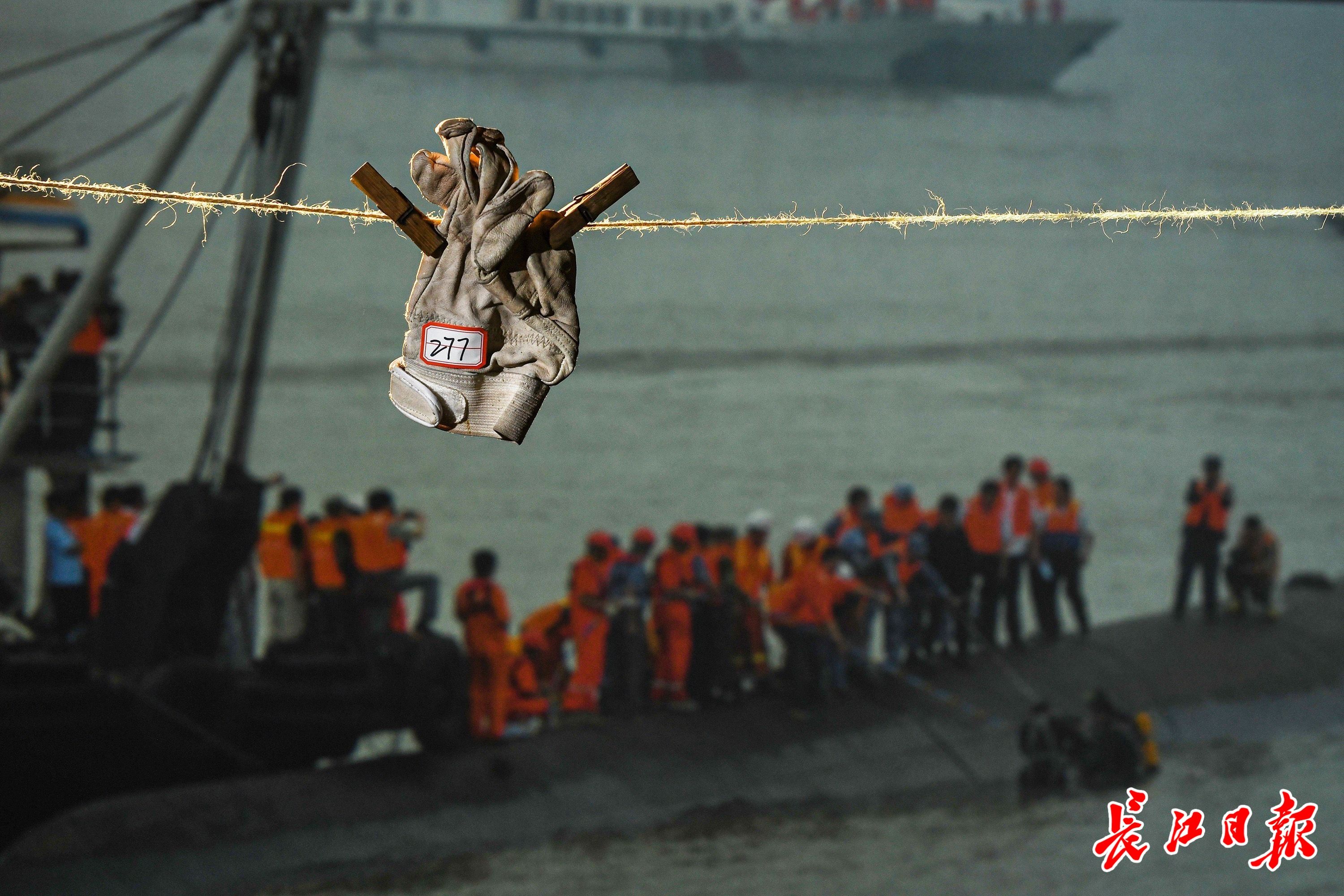 编号277手套展示在2015年6月2日“东方之星”客轮翻沉救援现场的照片前。这是消防员当时使用过的手套。