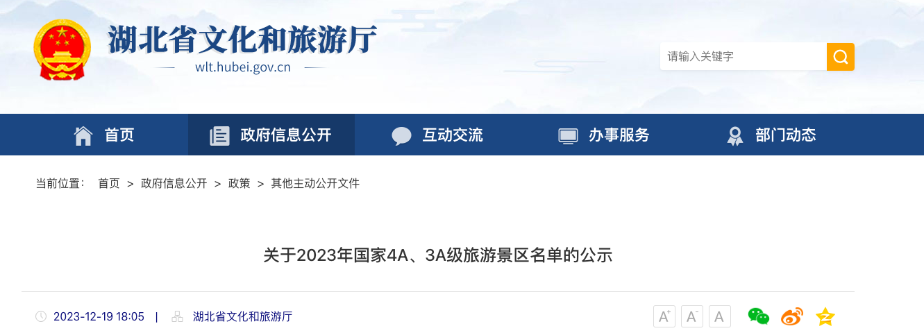 12月19日,湖北省文化和旅游厅公示2023年国家4A、3A级旅游景区名单,武汉2家景区位列其中。公示期到12月25日。