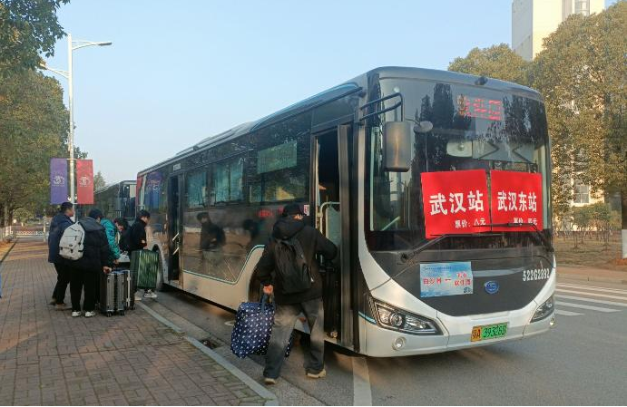 1月13日,就读于武汉职业技术学院的大二学生张庆祝,在学校东二门坐上了直达武汉站的定制公交直达专线,站点工作人员还帮助她把行李搬上了车。武汉公交第五营运公司开通了由武汉职业学院至四大火车站的定制公交直达专线。“今年方便多了,再也不用拖着行李箱到处换乘,一趟车就可以直达火车站,幸福触手可及。”张庆祝高兴地说。