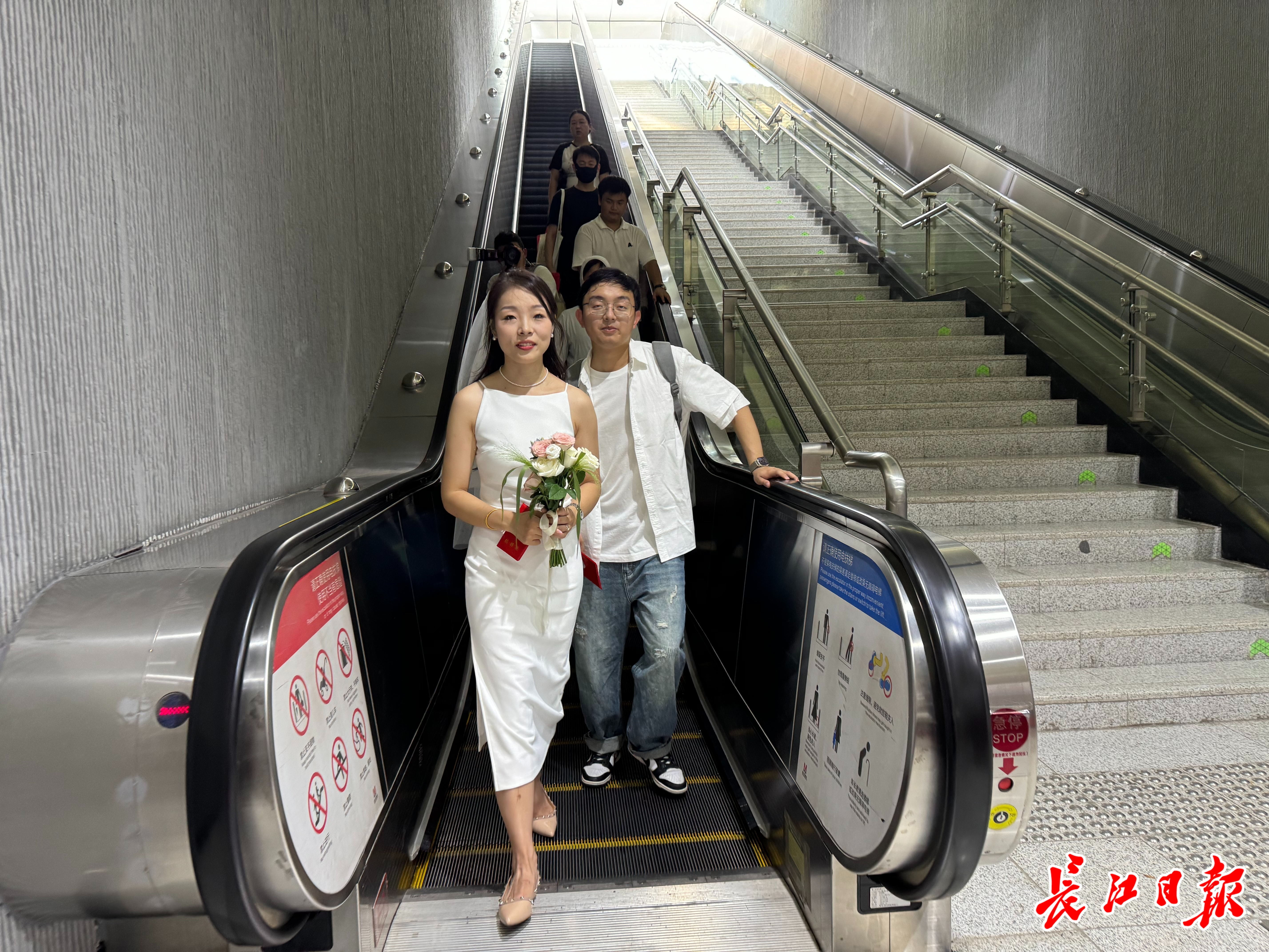 地铁5号线彭刘杨站,一对新人正在拍摄领结婚证过程。 记者陶常宁 摄