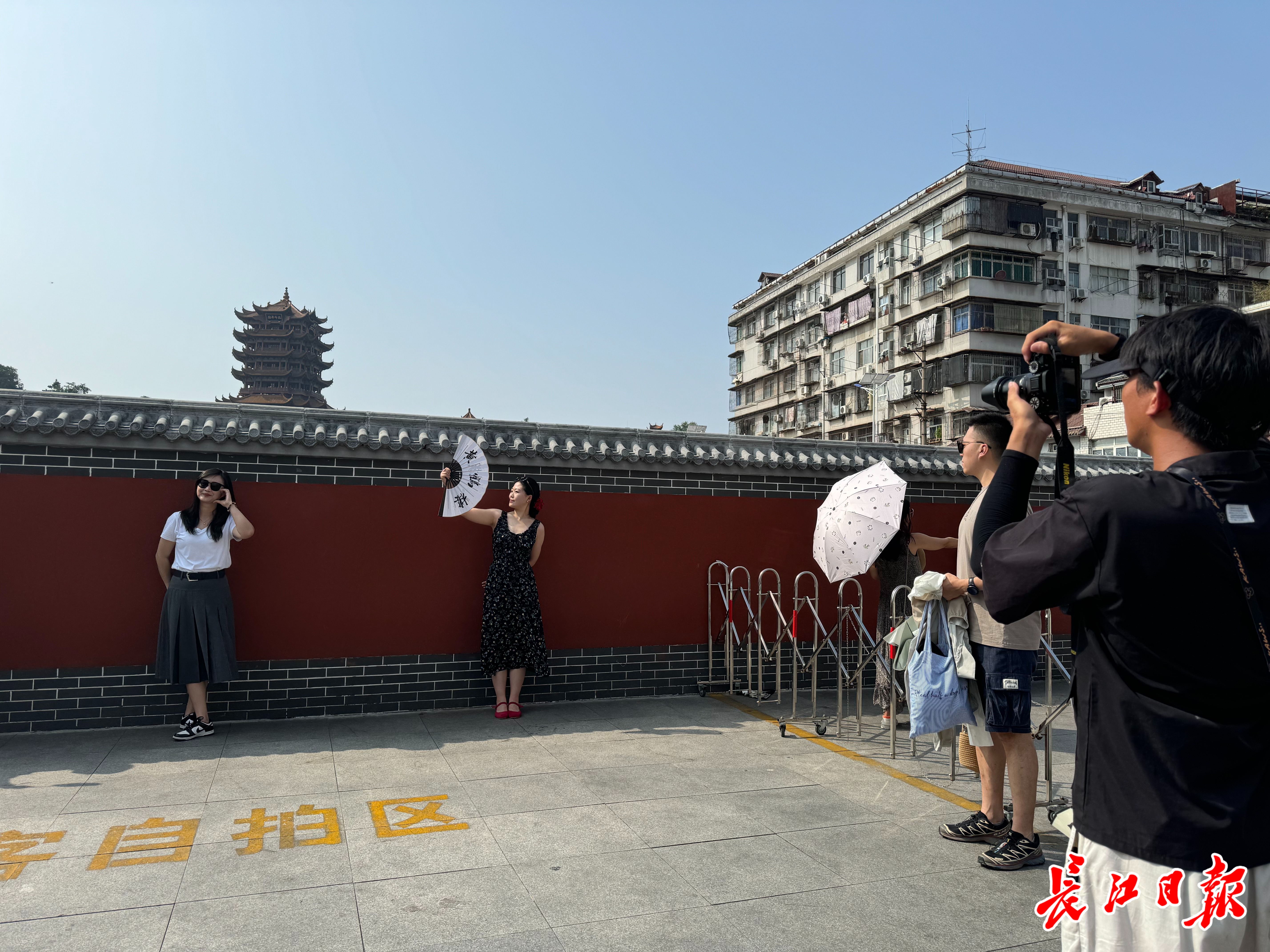 地铁5号线司门口黄鹤楼站,游客正在红墙前拍照。 记者陶常宁 摄