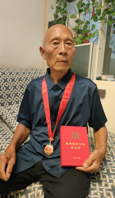 图为陈有银领取“光荣在党50年”纪念章拍照留念。本人供图