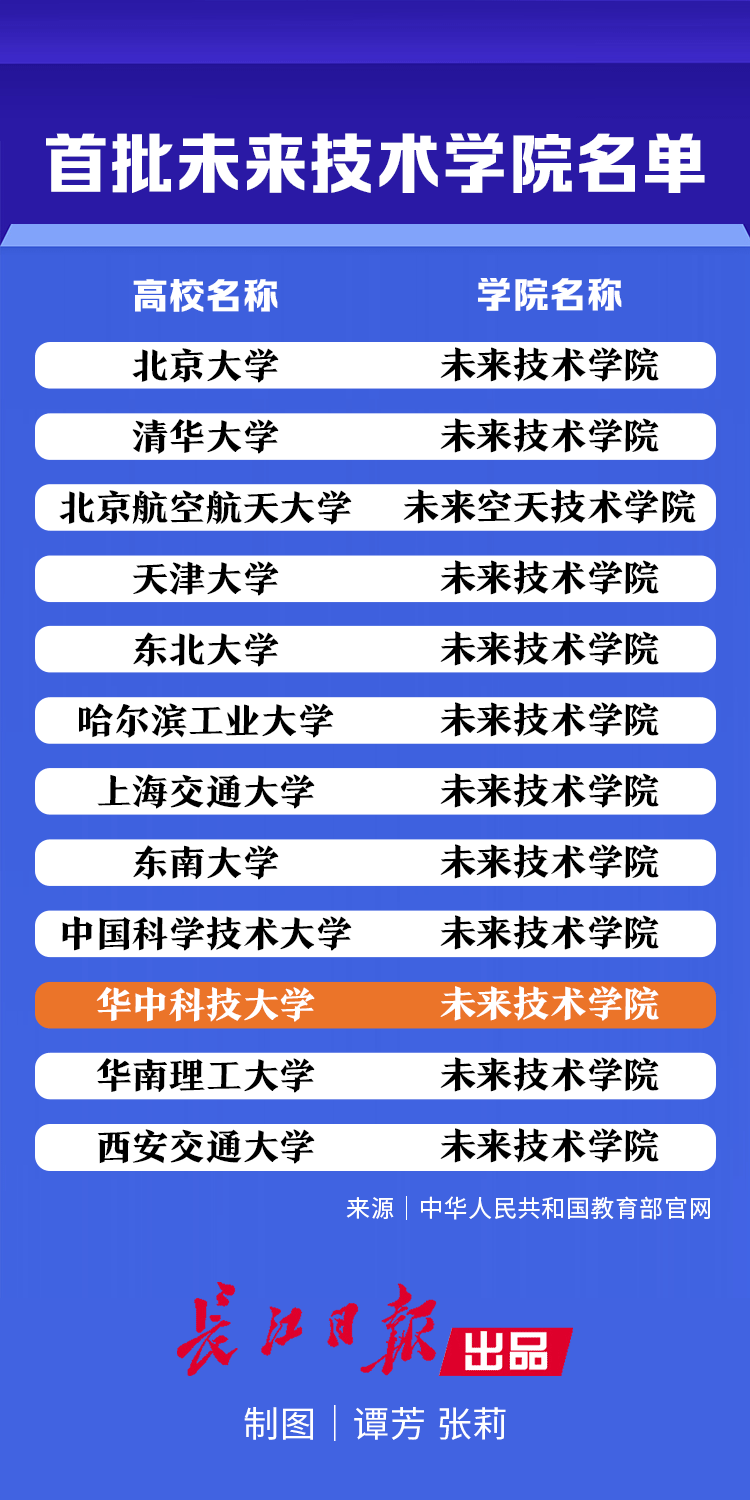 长江日报5月27日讯 据教育部网站5月26日消息,教育部公布首批未来技术学院名单,北大、清华等国内12所一流大学入选,位于武汉的华中科技大学也在其列。