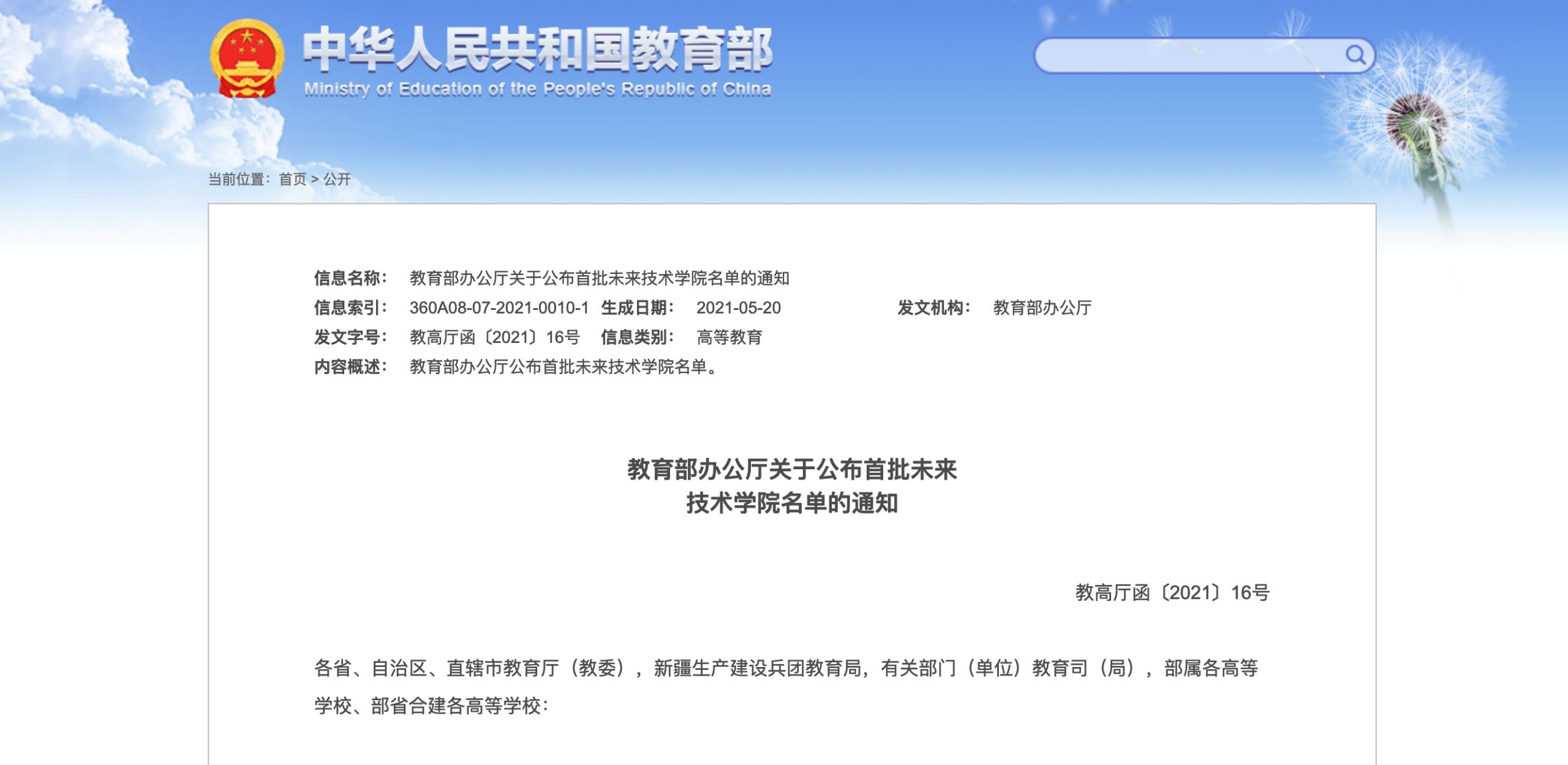 据悉,教育部办公厅曾于2020年5月印发《未来技术学院建设指南(试行)》,提出用4年左右时间在专业学科综合、整体实力强的部分高校建设一批未来技术学院,探索专业学科实质性复合交叉合作规律,探索未来科技创新领军人才培养新模式。