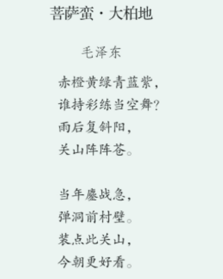 《菩萨蛮·大柏地》也同样收录在六年级(上册)语文课本中,这首诗词创作于1933年夏。大柏地一战,是红四军主力下井冈山以来的第一次大胜仗,被誉为“红军成立以来最有荣誉之战争”。这首词洋溢着欢愉的氛围,进而把革命战争与自然景色融为一体,赞美了伟大的人民革命战争,讴歌了革命根据地的兴旺景象。